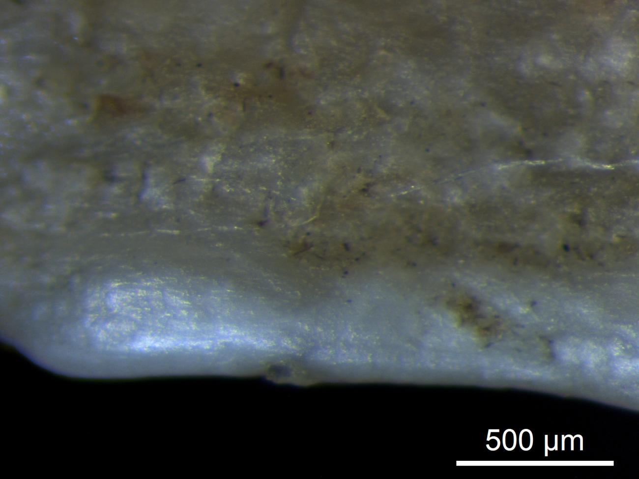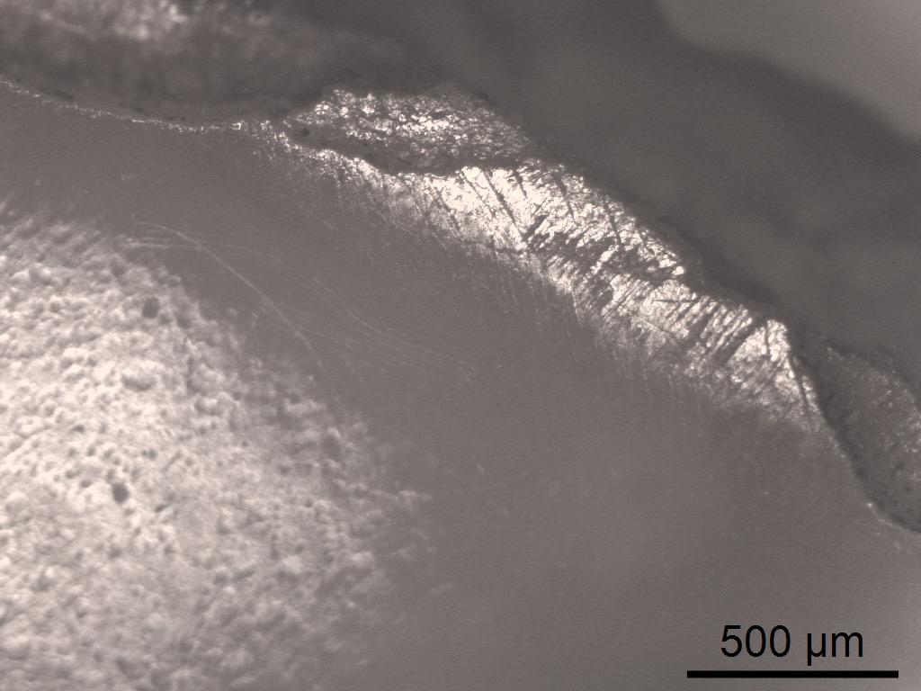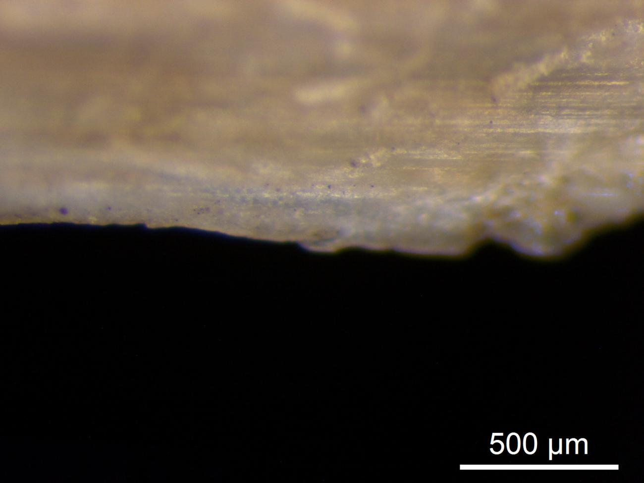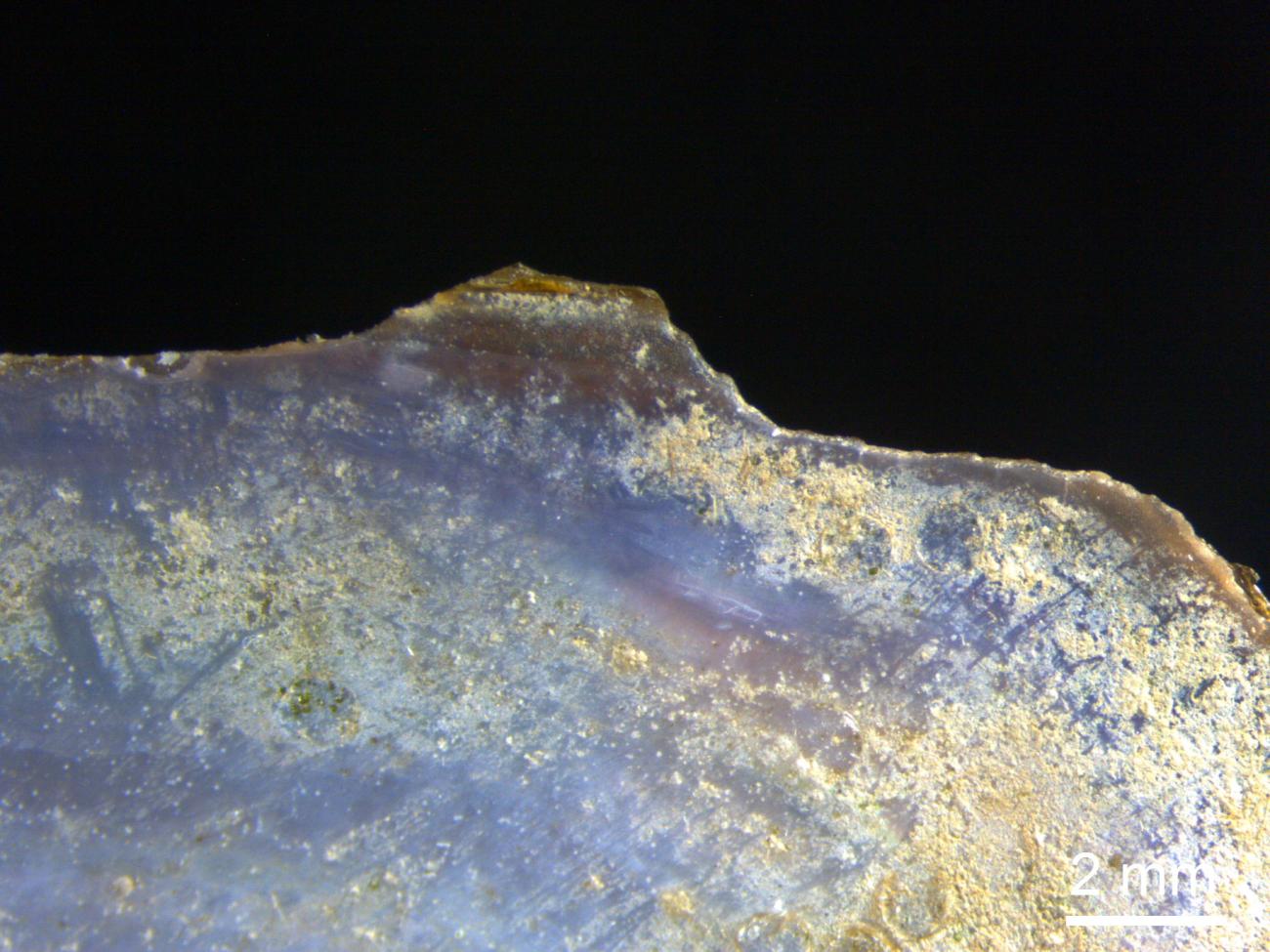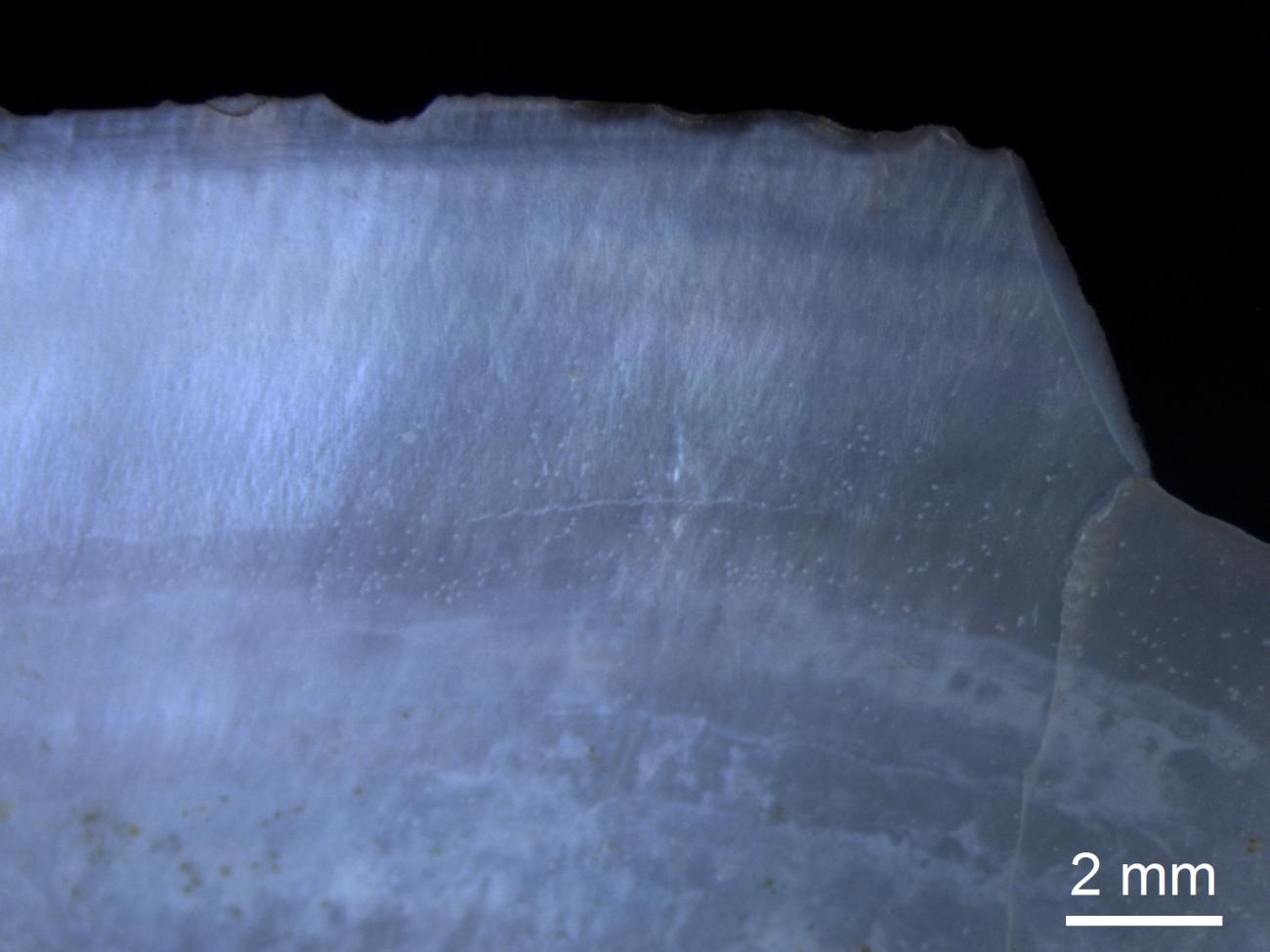 Hand-held shells, be it oysters, or freshwater mussels, showed strong alterations after being used to snap off cereal ears for three hours. Not only did the outer shell become worn away, but also the harder inner shell became dented, cracked up and in some cases fell off. Use-wear traces were visible as polish, striations, and edge rounding (See Figure 21). Very visible were the abrasion of the interior shell, changing from a dull brownish colour to a shiny bluish surface (See Figure 22).