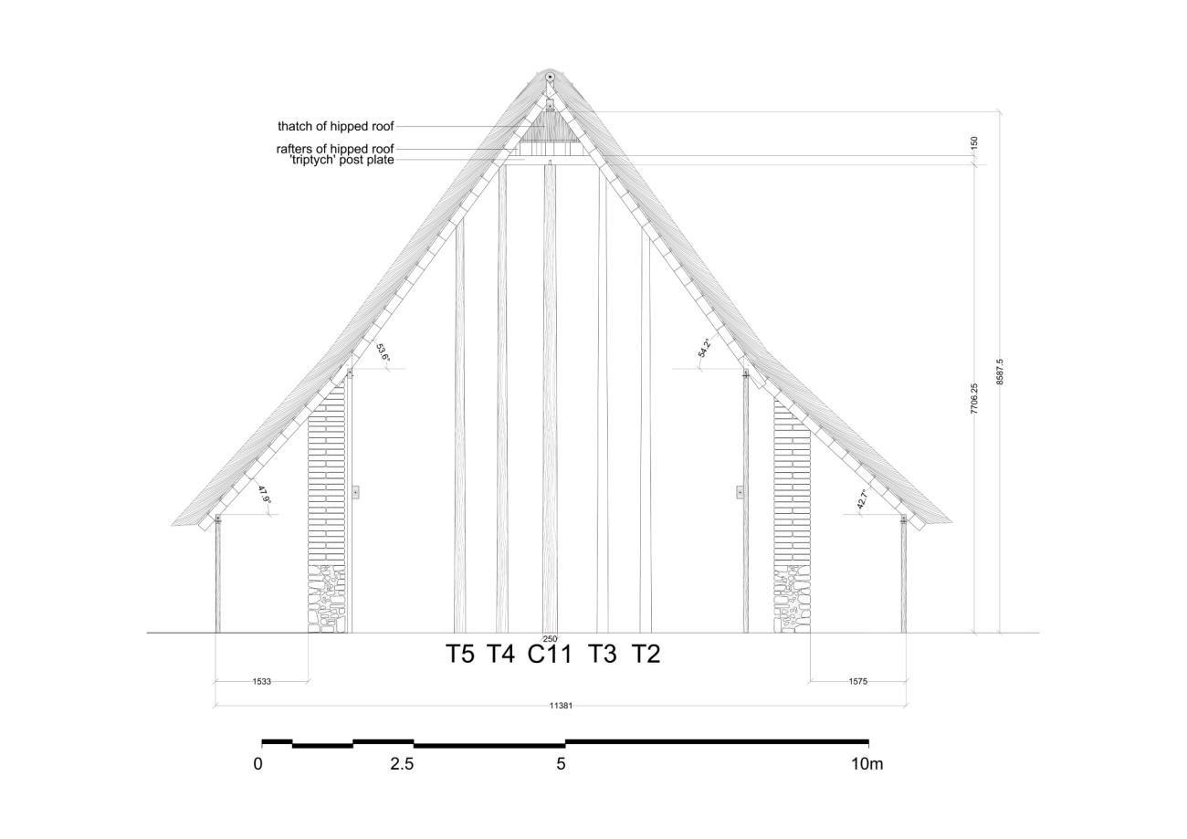 Figure 11 also depicts, in the centre, part of the different roofing arrangement that had to be adopted to cover the west half of the AR and the surrounding veranda. In this area, beyond C12, a hipped roof would have been used (See Figure 12),55 with a pitch of 47.2° and with the veranda roof built as an extension of the roof over the west half of the AR. The hipped roof would have been supported by a special, 'triptych'-like structure made of the centrally located (but not ridge-supporting) post C11 and of posts T1-T3 and T4-T7 forming two almost symmetrical, L-shaped arrangements on either side of C11 (See Figure 6: Inset A).56 All these posts would have been crowned by plates: a horizontal plate over posts T2, T3, C11, T4 and T5 (See also Figure 11); two cranked plates respectively over posts T1-T2 and T5-T6; and perhaps also another horizontal plate over posts T1 and T6 for the bracing of the 'triptych'57 (not shown on Figure 6). On the plates of the 'triptych' would have rested the upper ends of the interior rafters of the hipped roof in a fan-shaped arrangement with their lower ends resting on the plates above the wall posts; the latter would also have received the rafters of the veranda roof (See Figure 6: Inset A and Figure 12). The plates for the wall- and veranda posts in the apsidal part of the building would probably be curved (rather than straight) timbers.58, 59 Adopting a hipped roof over the (west end of the) apse would have been yet another method - besides embedding the posts and adding verandas acting as aisles (supra) - used by the LK-T carpenters to ensure the structural balance of the building, since this type of roof offers the advantage of resisting high winds.60
