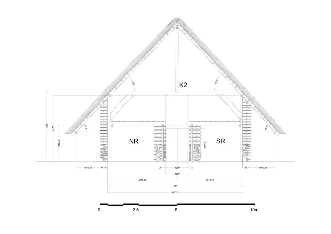 There are, however, three areas where crossbeams would have been necessary and, at the same time, sufficient to brace the entire structure.34 The first two areas are those of the partition walls between ER-CR and CR-AR, where the intermediate (ridge-supporting) centre post had to be banned due to the presence of a doorway and replaced by a 'king post', i.e. a shorter vertical post supporting the ridge at a higher level, namely within the roof space, and standing upon the midpoint of a crossbeam (See Figure 4: 'king posts' K1 and K2). The crossbeams in these areas would have been carried at either end by the plates above the wall posts (See Figures 8, 9). The squared timber jambs of the doors in the partition walls between ER-CR and CR-AR could have extended to the underside of the crossbeams reconstructed in these areas, since in frame construction, openings such as windows and doors are commonly incorporated into the entire structure, being useful for filling-in the frame with materials.35