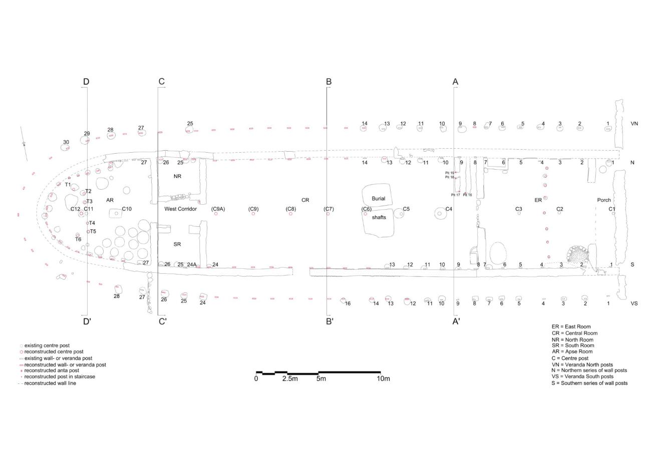 A prominent feature of the building, on which we will focus, is the large number of timber posts. These timber posts, after decaying, left clear imprints in the fill of the specially dug pits and, in some cases, their wood residue was preserved well above floor level. Thus, a series of posts of round cross-section (average diameter: 0.222 m)1 were set on the long axis of the building (henceforth, centre posts) dividing it into two aisles. In addition, a double series of posts of rectangular cross-section (average width: 0.22 m; average thickness: 0.072 m) ran (a) all along the inner face of the exterior walls (henceforth, wall posts) and (b) parallel with but at some distance from the west, north and south walls of the building forming a veranda (henceforth, veranda posts). This veranda is a forerunner of the peristyle (or pteron, peristasis) of Greek temples and the earliest attested example. Finally, there is a series of post pits across the ER and another across the AR.
