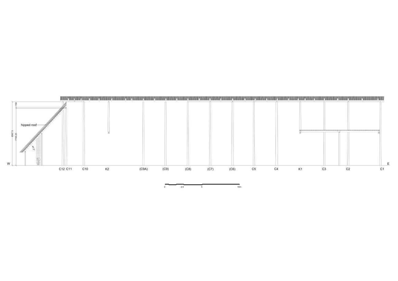 As already mentioned, in most of the building, except at the west end, the roof would have been gabled. More particularly, the 'prop-and-ridgepole' (or 'column-and-ridgepole') roof construction27 would have been used, with the ridge beams and the plates tying the building in the longitudinal direction, i.e. providing longitudinal linkage to the axial and side posts, respectively (See Figure 7).