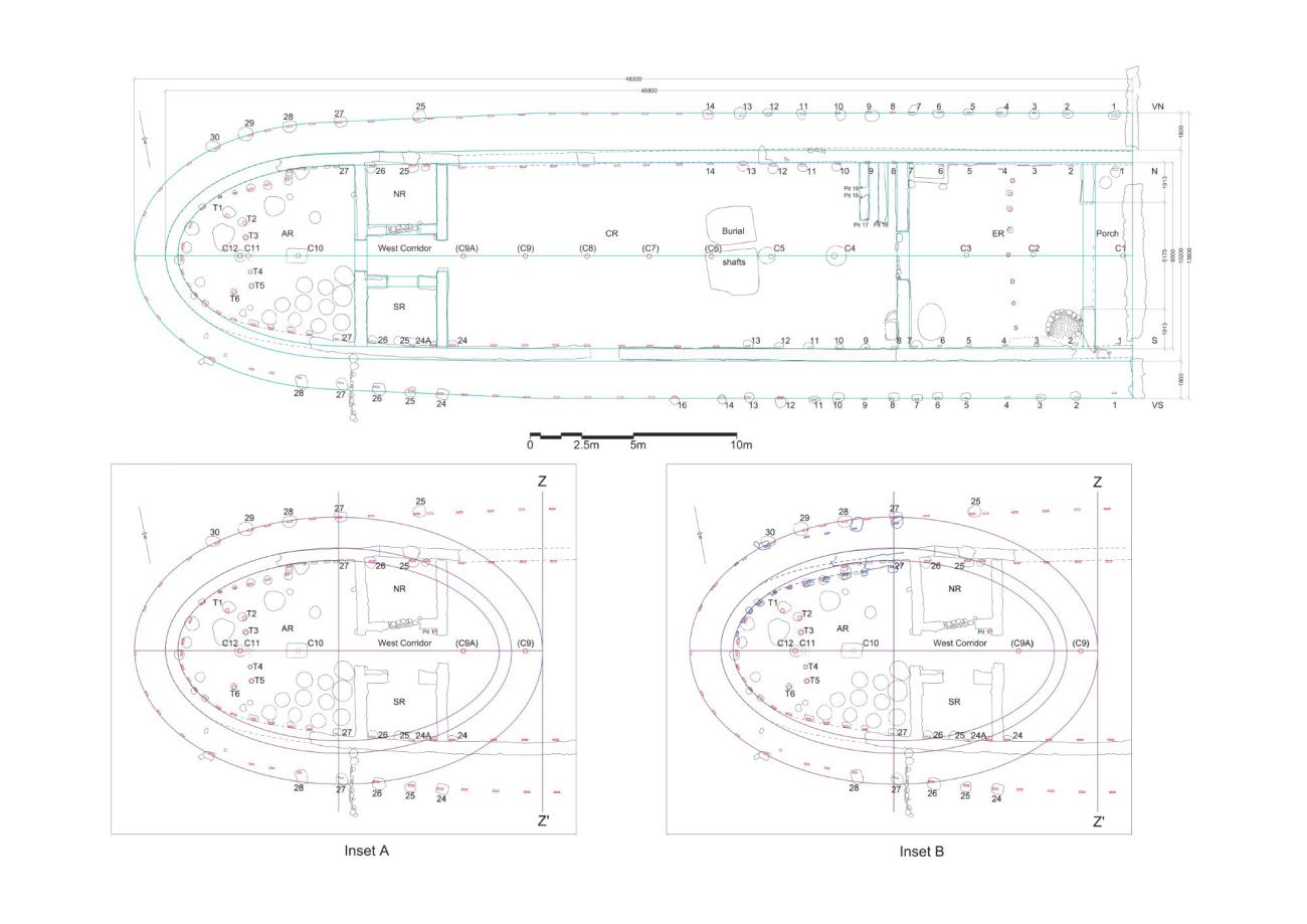 Including the veranda, the LK-T building would have measured 48.30 m x 13.80 m. Its reconstructed length - based on a geometrically generated triple-contour ellipse drawn for the ideal contours of the apse wall and its surrounding veranda, which are mostly missing - measures three and a half times its width throughout most of the building (except at the west end, where the building narrowed), as shown in Figure 2 with Inset A (the dimensions shown in Figure 2 and in the following figures are multiples or subdivisions of a foot of 0.30 m, a plausible local unit of length2). This is therefore the largest Early Iron Age building and the largest megaron known to us from ancient Greece. With its monumental size and megaron plan, as well as its surrounding posts in the veranda and its eastern orientation, the LK-T building is strongly reminiscent of later Greek temples.