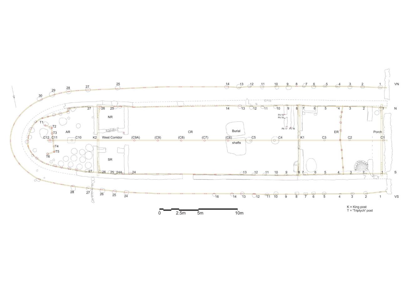 Posts N3, S3, VS4, VS5, VS8, VS9 and VS11 are skewed; post N4 is misaligned, being located c.0.2 m from the wall (Popham, et al., 1993, pp. 28, 39, table 2, pl. 38).