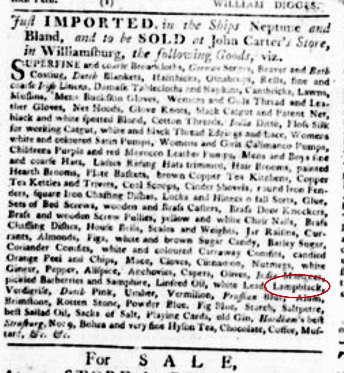 Gutenberg used lampblack inks for his printing press (Stinely, 2024), and the inks for presses continued into the American Colonial period. Peacham (1612) said: "The making of ordinary Lamp blacke. Take a torch or linke, and hold it under the bottome of a latten basen, and as it groweth to be furd and blacke within, strike it with a feather into some shell or other, and grinde it with gumme water […]" Printers continue to use lampblack as the base of their black ink, but the binder varies; in Colonial Williamsburg today, Pete Stinely, the master printer in Colonial Williamsburg, mixes his powdered lampblack with linseed oil for making his printing inks by hand.