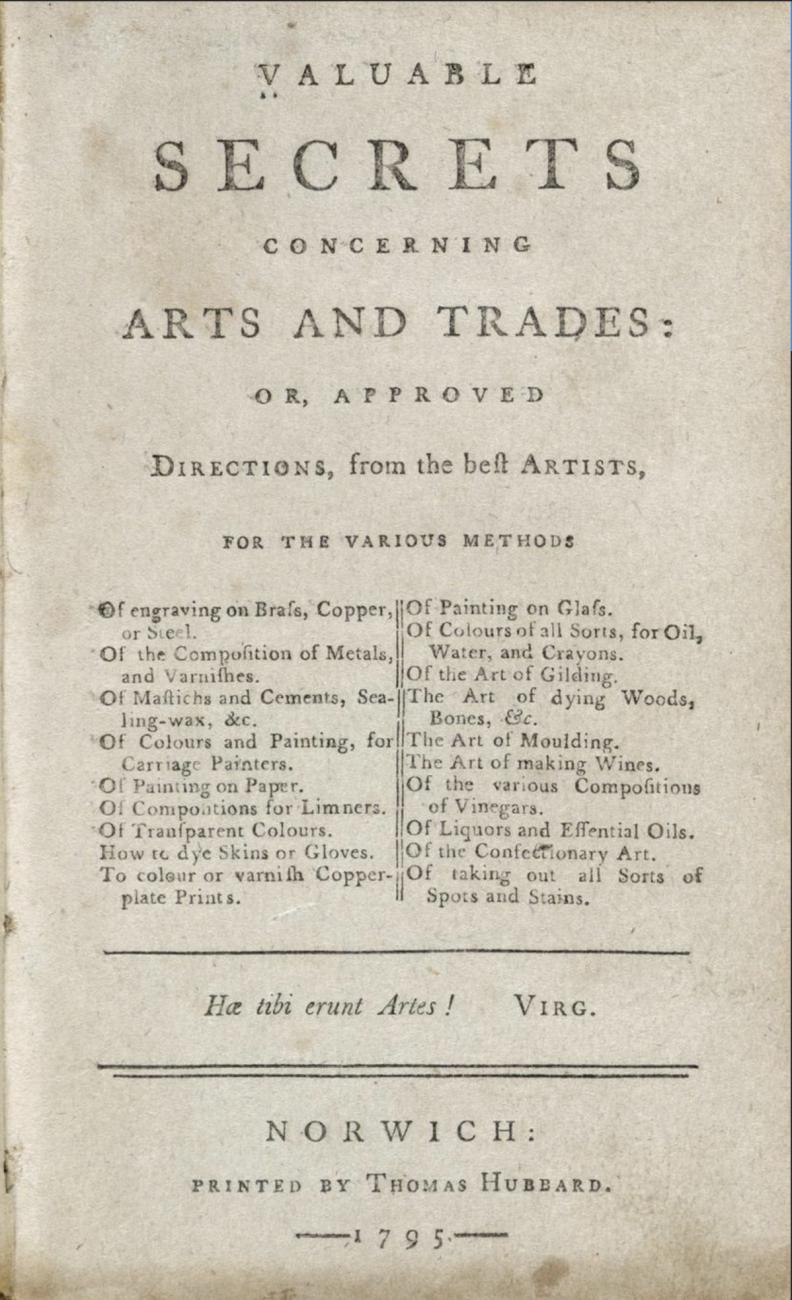 Hay, W., 1775. Valuable Secrets concerning Arts and Trades, or Approved Directions from the Best Artists for various methods. London: Will Hay. Available at: < https://play.google.com/books/... > (accesed 21 March 2025)