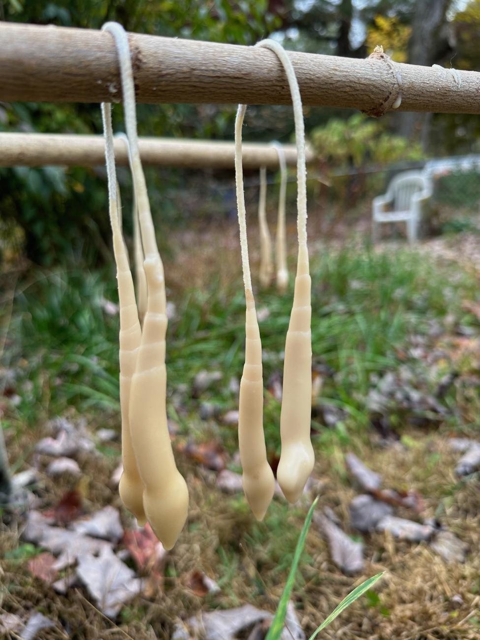- Final hand-dipped tallow candles for my purposes were approximately 0.5 to 1-inch (1.25cm-2.55cm) in diameter, with approximately 8-10 dips for each thin, small candle. Store after drying and cooling.