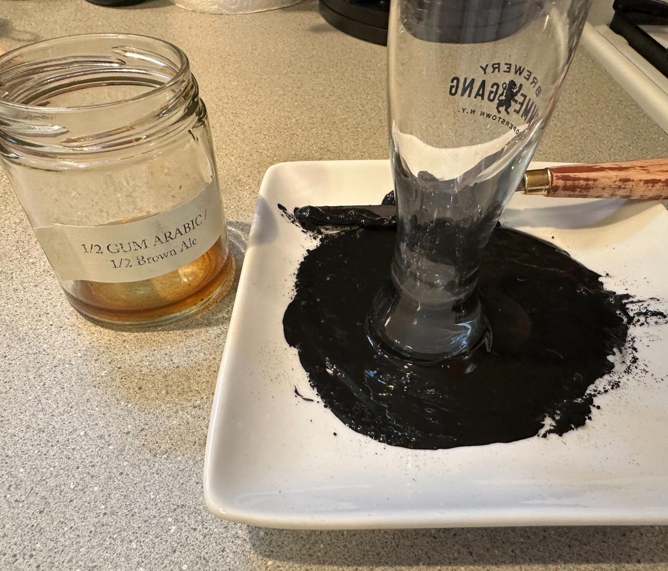 This experiment began with the effort to be as scientific as possible for my experiments: tightly controlled measurements of materials. I began by photographing my measured materials to identify the amounts used. My original methods - inspired by my desire to hew towards scientific precision - contrasted with period art books often mentioning approximate or no measurements at all. At first, these vague descriptions felt frustrating. After my first few sessions mixing materials, I realised why period 'art recipes' may have decided to use vague measurements like: "a little", "dissolve what quantity you want […]" and "it would be improper to add […]" (Hay, 1775, throughout); variations in conditions: humidity in the room, beer type, lampblack type (lampblack made by different sources or hand-made, or ivory black) all affected the measurements of my experiments.