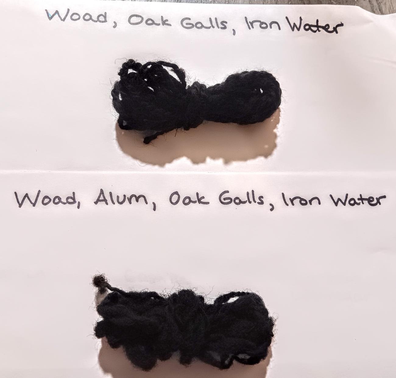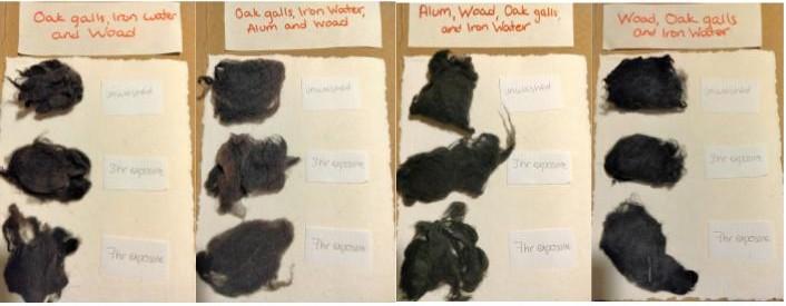 | Wool- Woad, Oak Galls and lron Water (Vat I) | 5 | Fair (impermanent) | 6 Darkest (Very Black) |