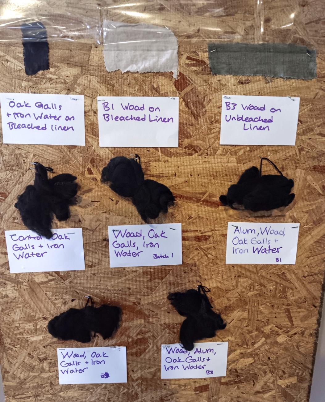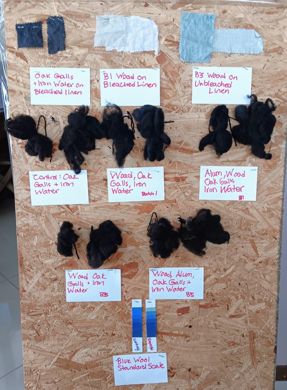 - Iron water and Oak Galls with Woad as over or under dye (Cardon, 2016; Ortega Saez and Cattersel, 2022)