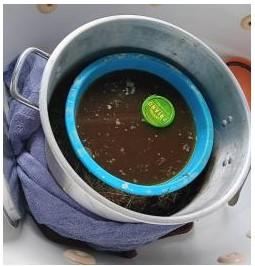 It is possible to revive dead vats, so I had hoped all was not lost. The following morning, a self-heating cat mat was placed under the pot, towels wrapped around it, and on top. I gently raised the temperature of the vat from 18 to 37.8 degrees Celsius by submerging glass jars of boiling water in it (See Figure 25). I whisked the vat vigorously until froth formed, before adding 40 oz of fermented room temperature urine (See Figure 26). The vat was whisked again for 30 seconds. I returned the hot water bottles to the vat to help maintain the temperature, put the lid on and draped a light blanket over the top, and left it to rest until morning.