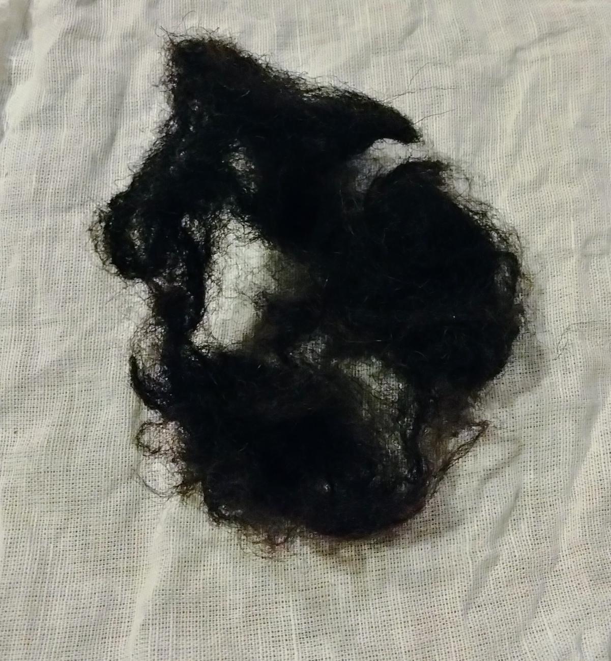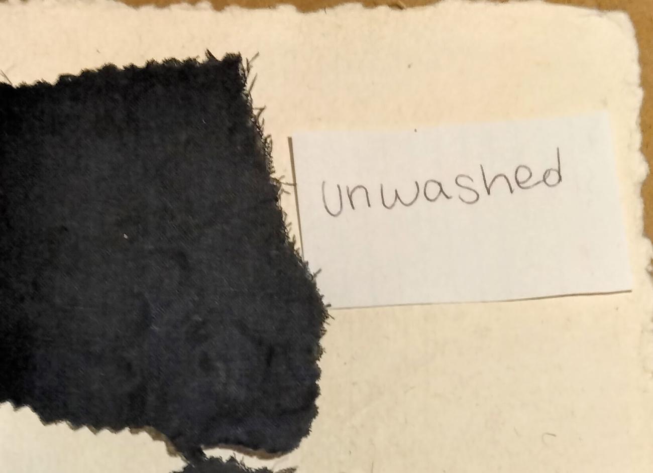 The sample that was not treated with alum combed out more easily, only resulting in about 25% wastage. The fibers spun easier and did not break. This variant is much better for weaving and created a great deal of yarn. There was some rubbing off of pigment onto the fingers of the spinner, much like one sees when dealing with new dark wash jeans. The dye easily washed off the hands, and did not result in a visible change in the hue of the fibers. (See Figure 21)