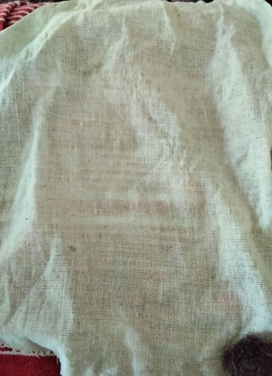 The process was still taking longer than it should have, so I added an additional puree of one teaspoon of oats mixed with 59 ml water, 59 ml of fresh urine, and 2.46 ml of washing soda on day 16. The pH remained a steady 10. On day 16, after additional oats had been added the day before, and more woad was added in the morning, the smell began to become sour and the colour of the vat became brown. At this point, I was out of time, and needed to dye whether or not the vat was ready.