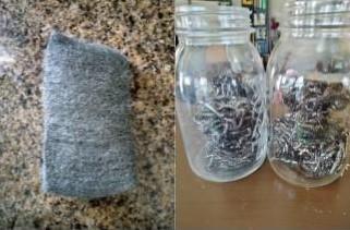 - The steel wool was then placed into quart jars, filling Âľ full, and covered with a combination of a two-to-one ratio of water and white vinegar. Caution was taken to not overfill the jar as the chemical reaction does cause it to initially bubble up.
