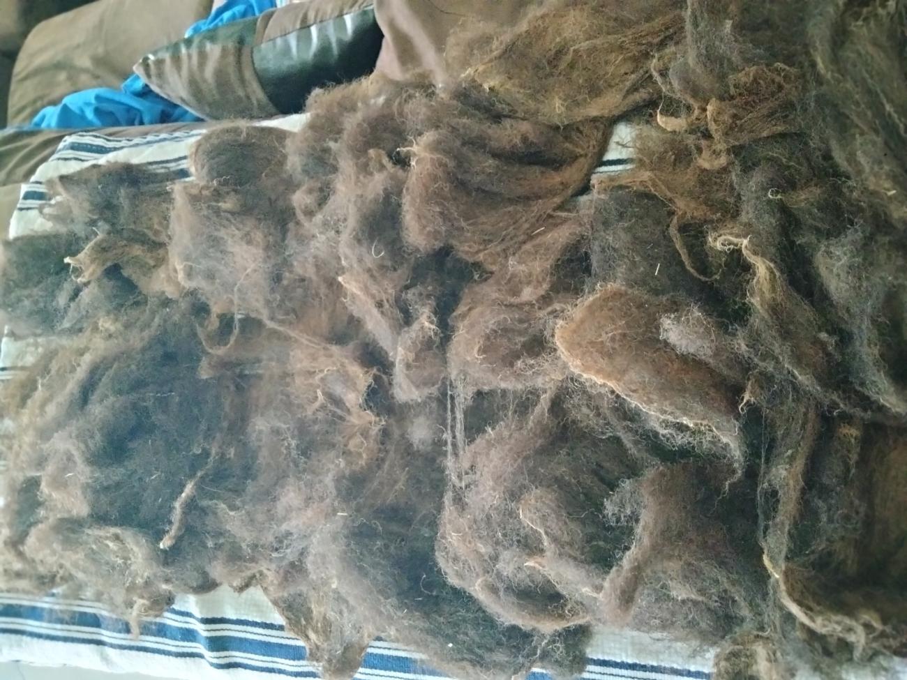 The sample of fleece treated with alum experienced a lot of fiber loss during the combing process, equating to approximately 75% of the original sample. Alum did seem to make the colour more fast, in that less dye rubbed off onto the hands of the comber and spinners. Spinning was extremely difficult, and the fibers kept breaking. Although the fibers seemed to be horrible for spinning and weaving, they were extremely soft and fluffy, and according to my spinner, seemed ideal for felting.