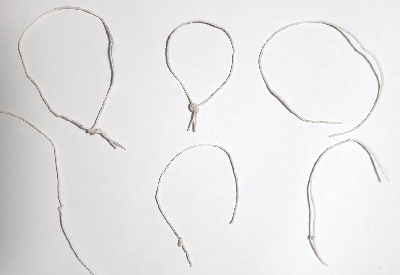 A hanging nodule is a simple piece of hand-formed clay that is squeezed around a plain, twisted or knotted string. The great range of string-knot arrangements used in the past was revealed by Montecchi (2017) who analysed silicone casts of broken hanging nodules kept in the Corpus of Minoan and Mycenaean Seals archive and identified at least four different arrangements: 1) nodule over a single knotted end of a string; 2) nodule over the length of a single (at times knotted) string; 3) a nodule over the two loose ends of a string; and 4) a nodule over the two twisted ends of a single string. Unlike the examples in the archive which were broken, many of these administrative clay objects have been found intact with the string burnt out following an accidental fire that turned the artefact into fired ceramics. Therefore, this experimental study was performed to determine whether the type of knot (single or double), the number of strings (one, two) and their arrangement (simple, twisted, knotted) can be visualised with X-radiography non-destructively (See Figures 5-6). The clay was allowed to air-dry before X-rays were taken. Because of the different radiodensity of clay and string, one would expect the string and knot to be clearly visible on the X-ray. Future experiments may wish to investigate whether different string materials could be visualised accurately by X-ray.