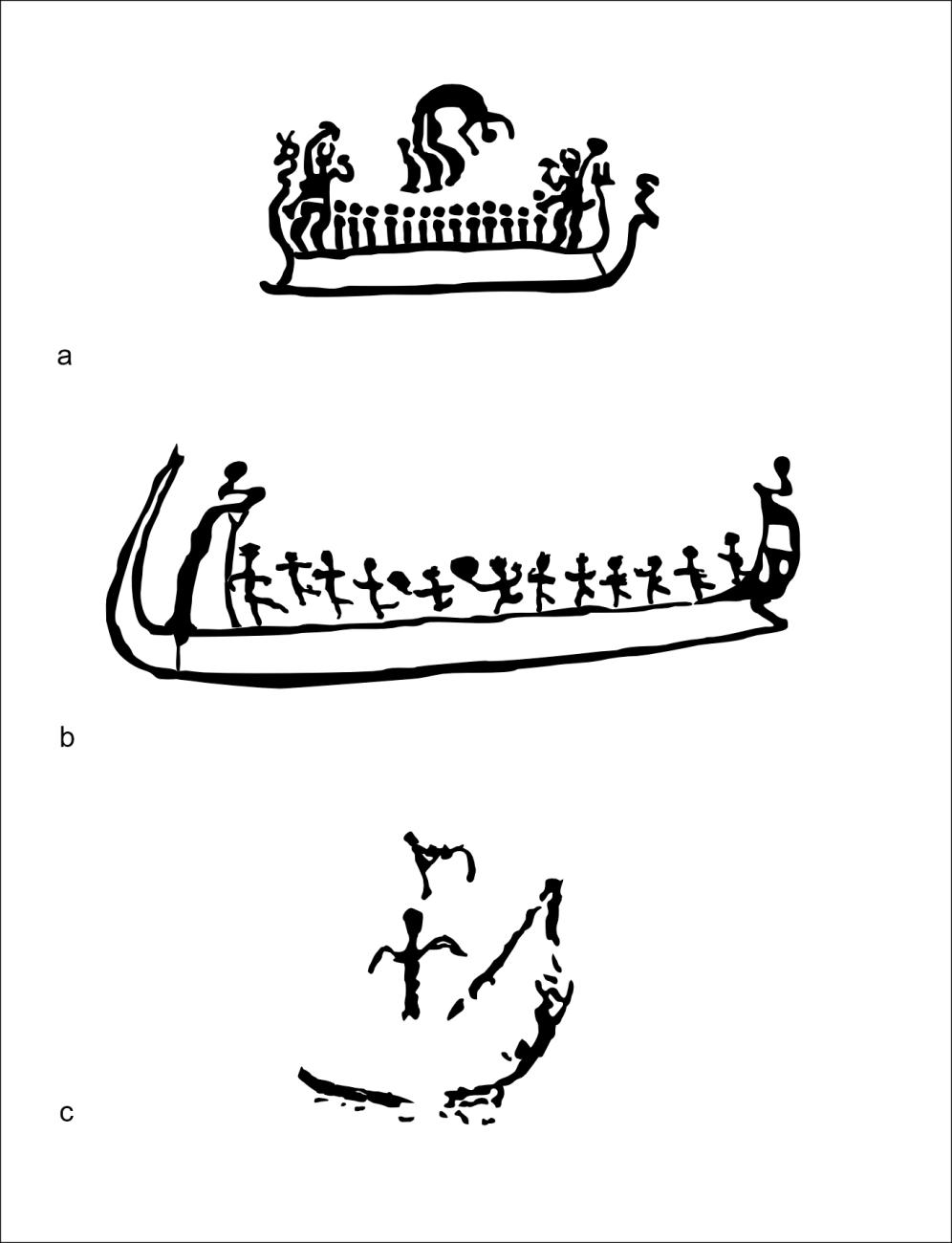 The boat is one of the most common motifs in Northern European rock art, often represented by a more or less curved horizontal line. Likewise, the people in the boat are mostly depicted as simple vertical lines, but in those cases where more detail is shown, their positions look very peculiar. In Swedish Bronze Age rock carvings, people jump backwards on a boat (See Figure 1a) (Almgren, 1959; Bengtsson, 1999; Milstreu, 2007; Larsen, n.d.), while in Norwegian Early Metal Period rock carvings they beat a drum and stretch out their arms and legs, as if dancing (See Figure 1b) (Helskog, 1988, pp.53, 94, 133; see also Gjerde, 2010, pp.444-445). In Finnish Neolithic rock paintings, the people associated with boats hold each other's hands, raise their arms upwards like wings (See Figure 1c), or stand on their toes (Kivikäs, 1995, pp.58-60, 150-151, 240; Lahelma, 2008, pp.213, 217). Moreover, the people depicted around a boat have their knees bent, ankles crossed, or legs writhing like snakes, suggesting some kind of dance position (e.g. Kivikäs, 1995, pp.81-82, 220; Leisiö, 2000; Miettinen and Willamo, 2007, p.77). We can surmise that boats as physical objects had a central role in the ritual activities associated with these shore-bound rock art sites, especially in Finland. The Finnish rock paintings are located on vertical cliffs rising directly from the lakes, so the paintings must have been crafted from the water, probably sitting or standing in a canoe (Jussila, 1999; Lahelma, 2008). The same applies to offerings made at the foot of the painted cliffs, such as amber pendants, arrowheads, and antlers (Grönhagen, 1994; Lahelma, 2006). The soundscape of the Finnish sites was also special, as the cliffs generated echoes that double all sounds of movement, paddling, talking, and drumming (Rainio, et al., 2017; 2024).