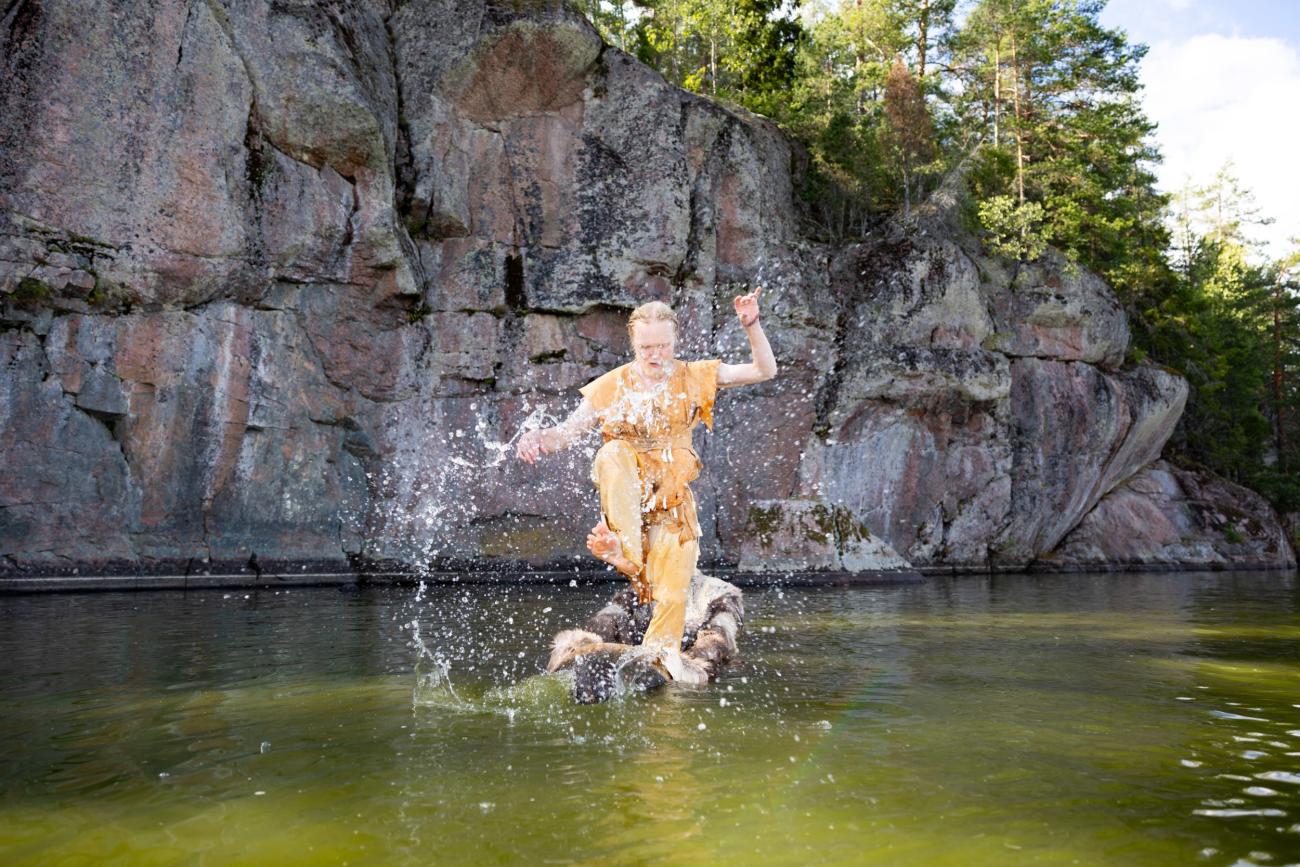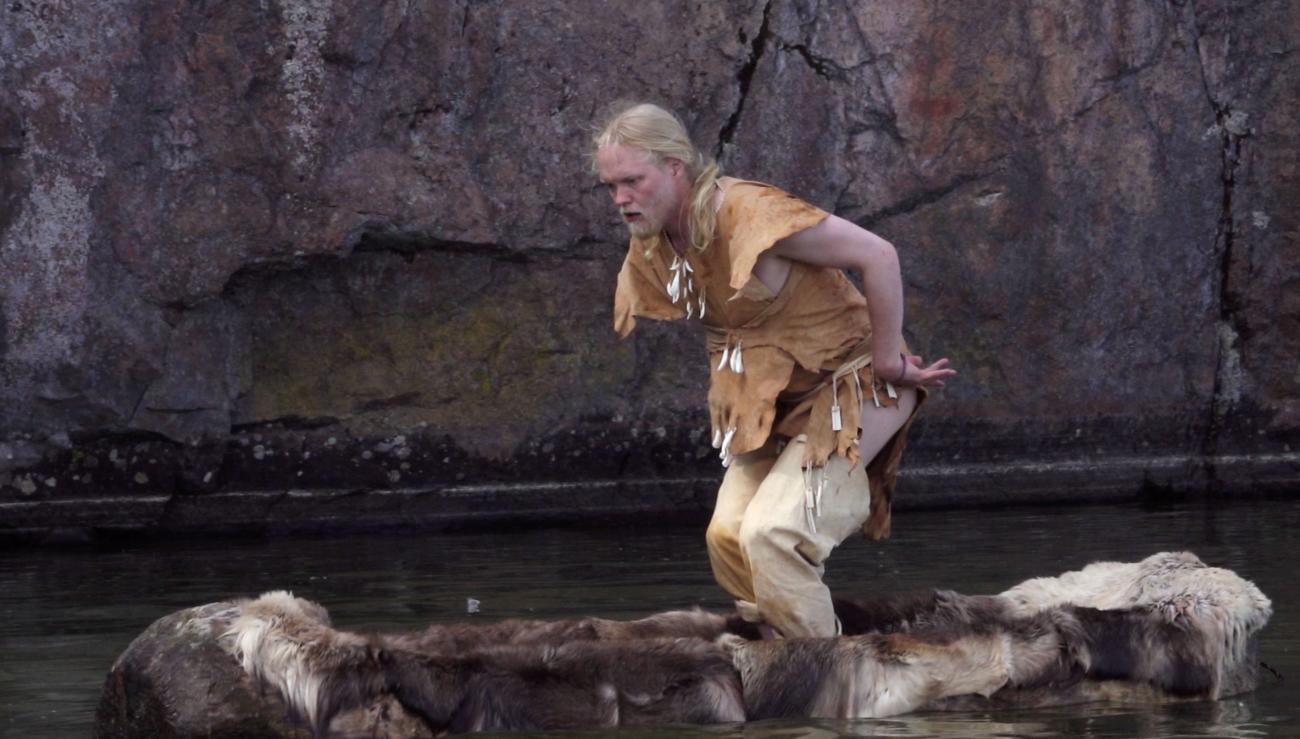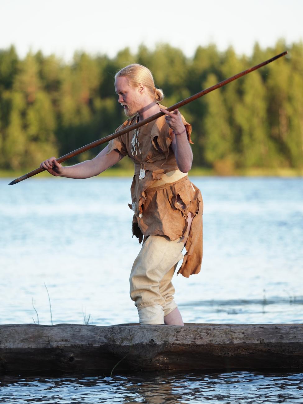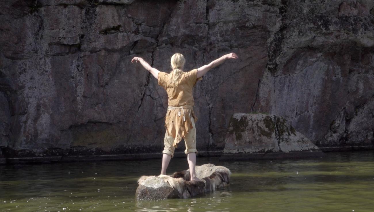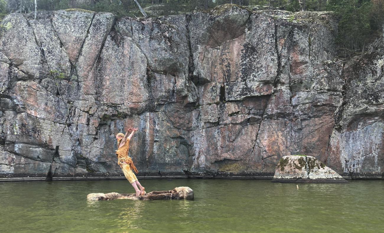 This article reports on an artistic-scientific experiment inspired by such Northern European rock art, in which dancer Arttu Peltoniemi spent a few months working in and with a Stone Age style dugout canoe, creating an artwork called the Dug Boat Dance (Ruuhitanssi). The Dug Boat Dance was performed in a reconstructed Mesolithic-Neolithic -style outfit at the rock painting site of Salmijärvi in Finland (See Figure 2). The research questions of the experiment included: 1) Is it possible to dance in a boat? 2) What kind of movements and bodily sensations does dancing in a boat, on an unstable rocking platform, produce? 3) Is it possible to gain information about the dance practices and rituals of the past through the bodily experiences of a contemporary dancer? Since the Dug Boat Dance was a unique project in concept and execution - possibly even the first of its kind worldwide - we report its results in this article based on Peltoniemi's interviews.