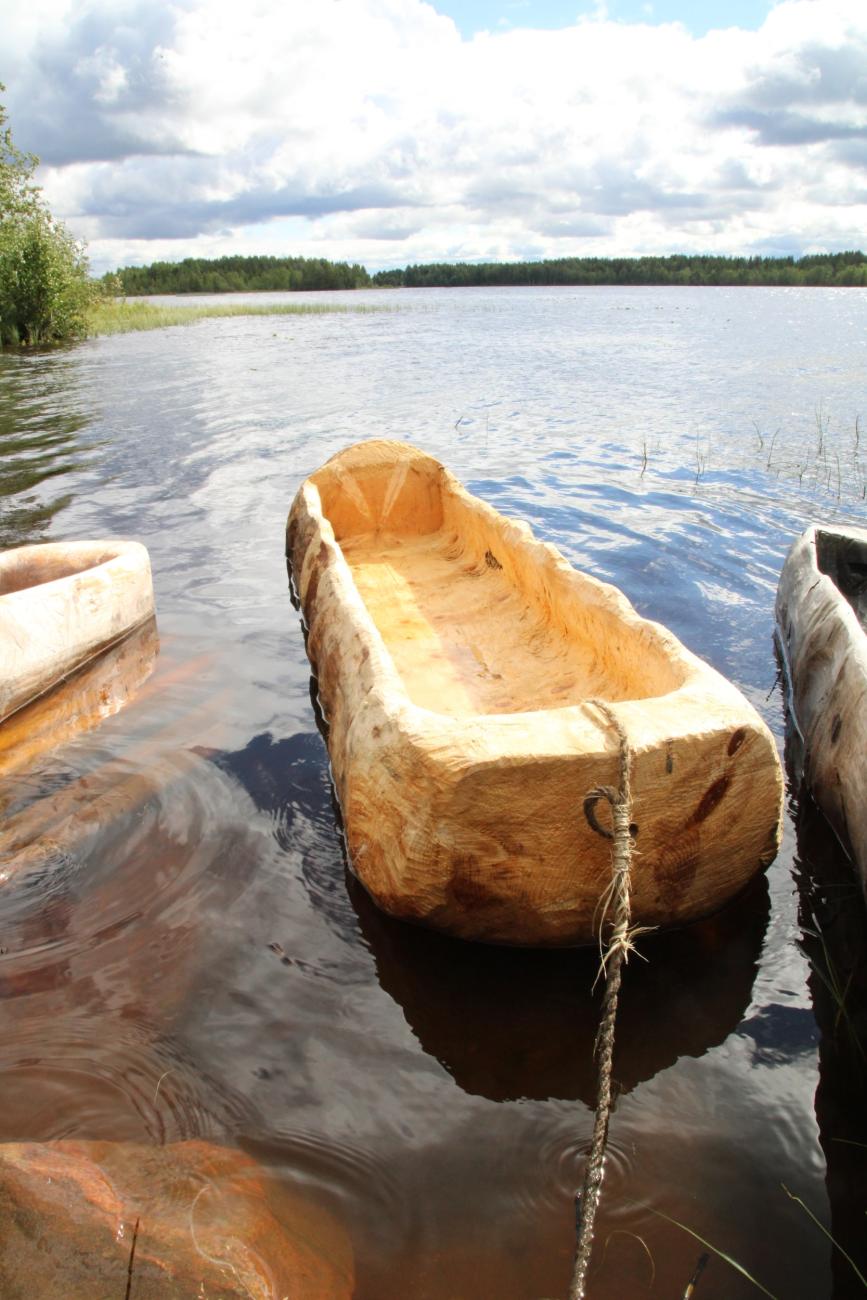 On paddle rounds near Pukkisaari Island, Peltoniemi learned that the dugout boat would not sink to the bottom even when it was filled by large waves and submerged; he could just continue paddling in waist-deep water. Under normal conditions there was always a little water in the bottom of the untreated boat. This made moving slippery, but Peltoniemi solved the problem by placing reindeer (Rangifer tarandus) hides and reeds in the belly of the boat:
