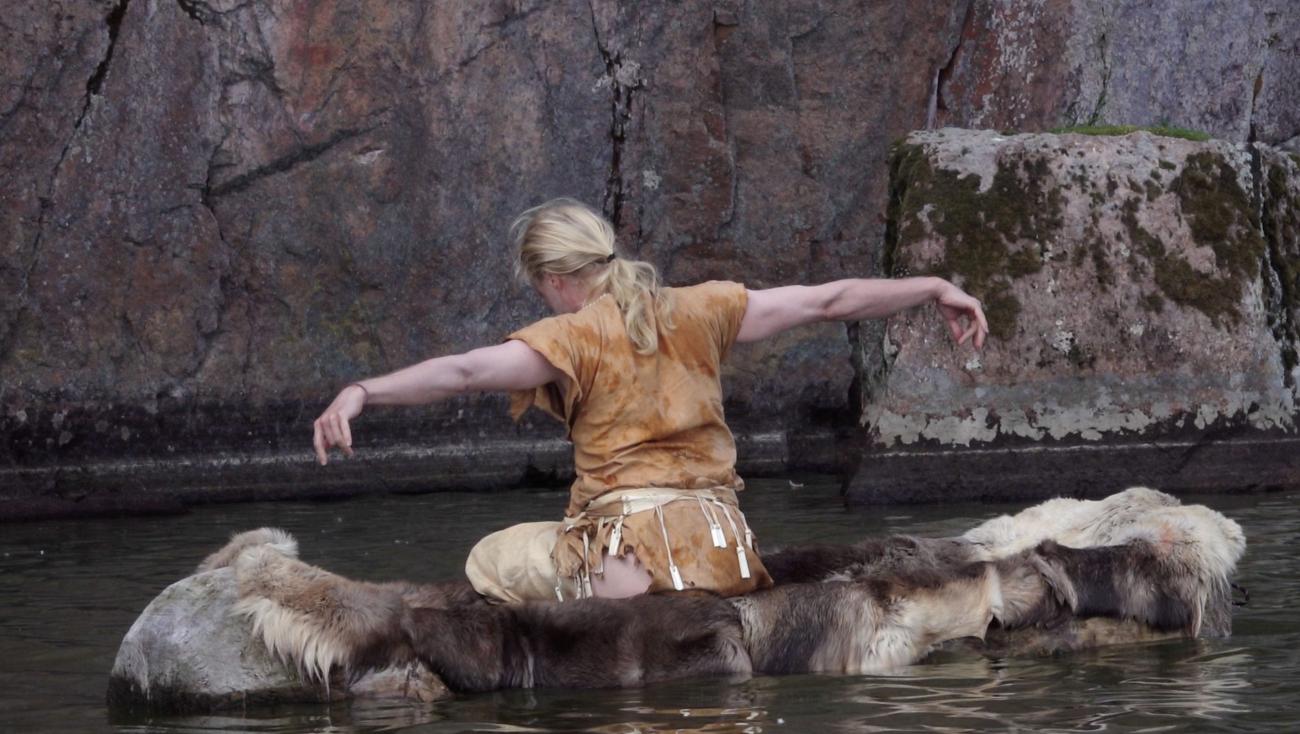 Experimental archaeology replicates past phenomena to generate and test archaeological hypotheses (Mathieu, 2002, p.12; see also Coles, 1979). The replicas, reconstructions, or working constructions typically involved in such efforts are usually physical objects or technical processes intended to provide analogies for interpretation. In the case of the Dug Boat Dance, the phenomenon to be replicated was dancing in a boat, as suggested by the rock art. The experiment was carried out in a watercraft, outfit, and place corresponding to the Stone Age setting as accurately as possible. However, the main element of the experiment was the living body of the dancer, whose sensory perceptions, reactions, somaesthetic experiences, and learning processes provided a source material for new information. Thus, unusually for experimental archaeology, the main research tool was the artist's body and artistic work.