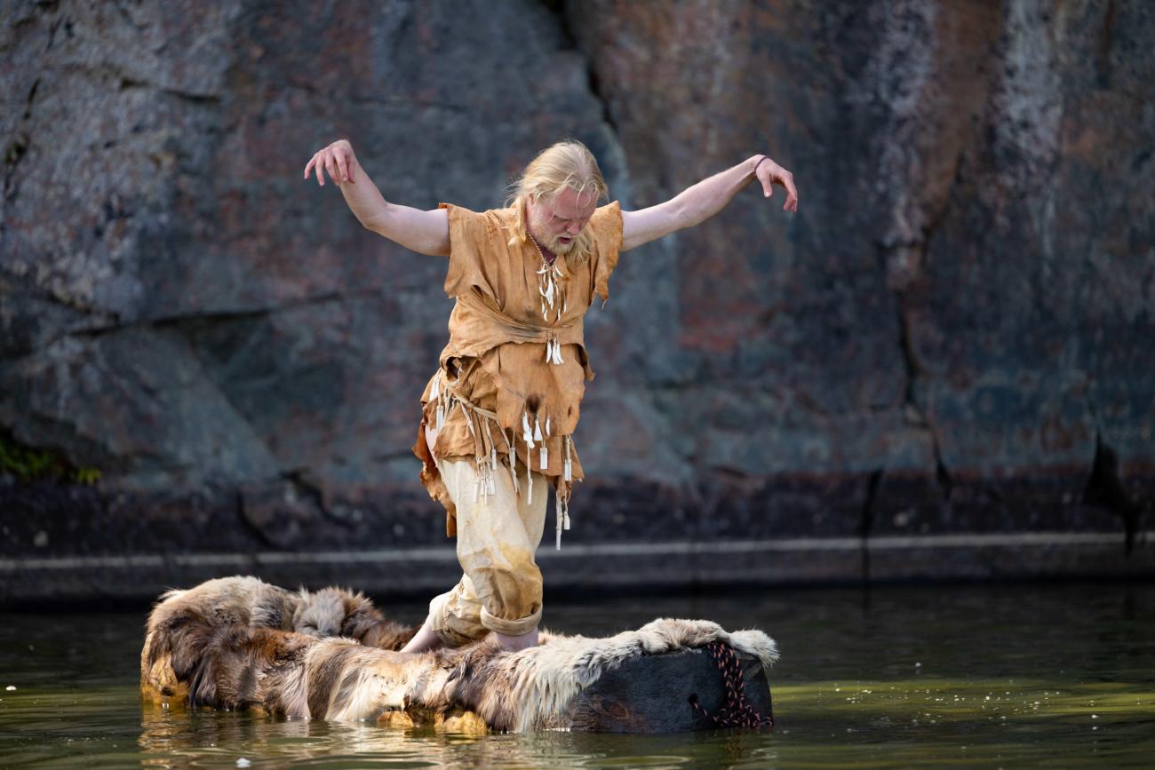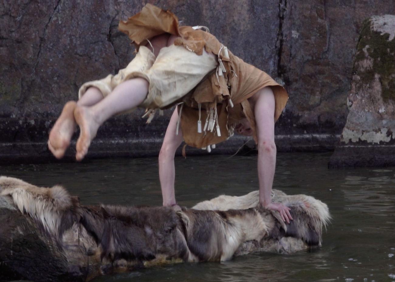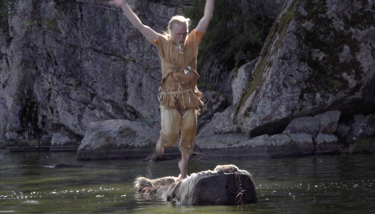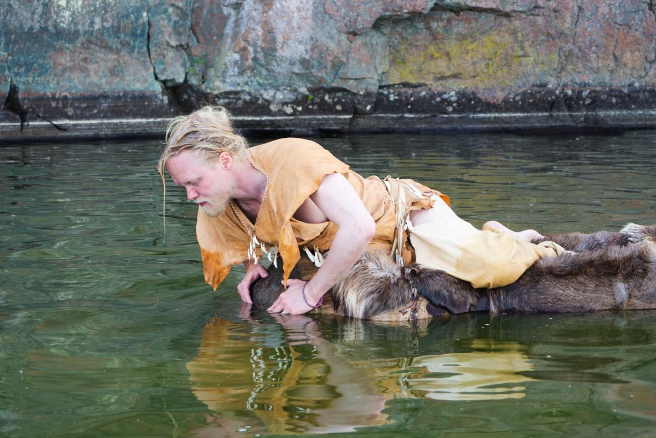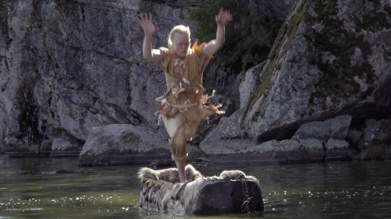 In his performances of prehistoric dance, working without musicians, Arttu Peltoniemi usually gives sonic support to his movements with simple, animal-like calls and sounds, as well as slaps and taps he makes himself. In the Dug Boat Dance, new sound elements were included: