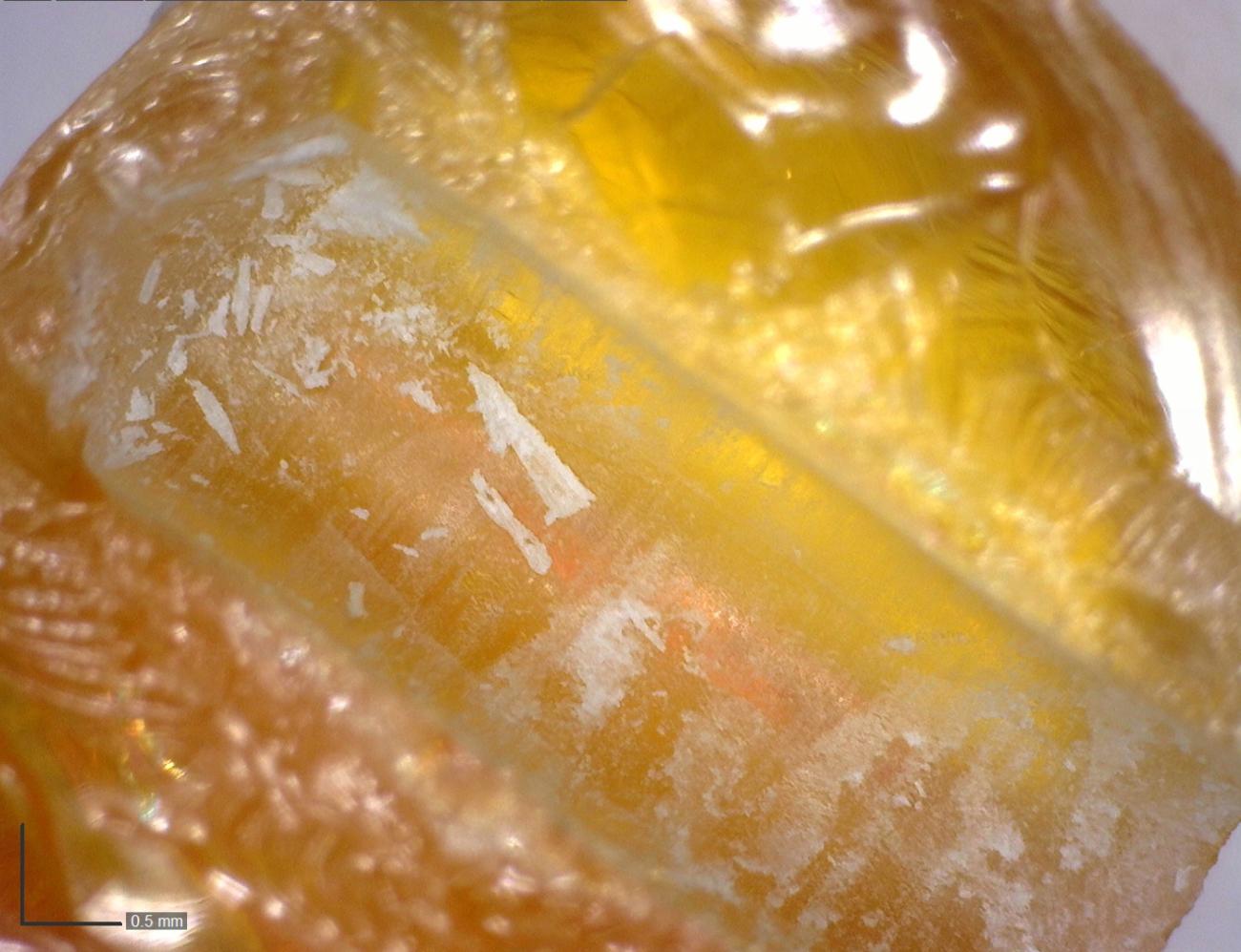 It has been suggested that opaque ambers would be more susceptible to splitting during drilling because internal flaws are less likely to be visible in the body of the bead blank (Mainman and Rogers, 2000, p.2501). In recognition of this, the colour and transparency of the amber were recorded during the drilling experiments. Pale and opaque ambers (sometimes called bone amber) did not shatter or split at a noticeably higher rate than the darker or more transparent orangey ambers. Since the colour does not seem to markedly affect the working properties of amber, any preferential selection of amber of a particular hue or transparency by early medieval amber-workers is likely to have been primarily an aesthetic choice. The only exception to this was poor-quality amber containing lots of dark inclusions, which did prove difficult to successfully drill; this would almost certainly have been avoided, perhaps even at the point of collection.