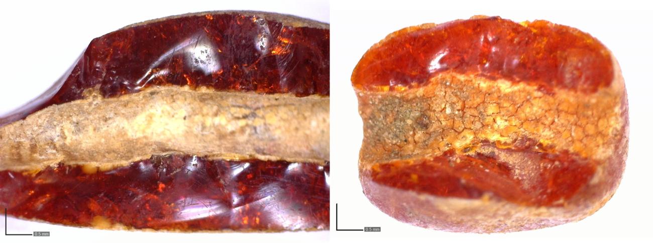 Making amber beads results in a range of production waste. Amber dust and tiny crumbs are produced during all stages of manufacture, including sawing, carving, grinding and drilling. Drilling also produced larger amber shavings. Small, detached flakes of amber were also frequently lost from surfaces during sawing, drilling and carving. The present experiments also produced numerous small pieces of amber, too small to be usable, left over from dividing larger nodules into suitably sized pieces for replicating individual beads. Often these pieces had a single worked face, with clear saw or knife marks visible (See Figure 20). It is likely that an early medieval bead-maker would not produce these kinds of worked waste pieces at the same frequency as the current experiments, on the assumption that the size of the finished beads will be more directly related to the size of the raw nodules in most cases. Nevertheless, small, minimally worked waste fragments of amber are present at almost all of the identified Viking-Age workshop sites (Ulbricht, 1990, p.75; Gjøstein Resi, 2011, p.110; Mainman and Rogers, 2000, p.2504; Wallace, 2016, p.291; Botfeldt and Brinch Madsen, 1991, p.103). The other substantial category of working waste was failed beads, most of which split during drilling (See Figure 21). The size of most of the replicated beads meant that, once a bead split, the two halves were each too small to be worked into another bead. Again, a comparison with the Viking-Age amber workshops would suggest that these failed beads would typically be simply discarded as waste (Sindbæk, 2023, fig. 15.4; Gjøstein Resi, 2011, p.110; Botfeldt and Brinch Madsen, 1991, p.101).