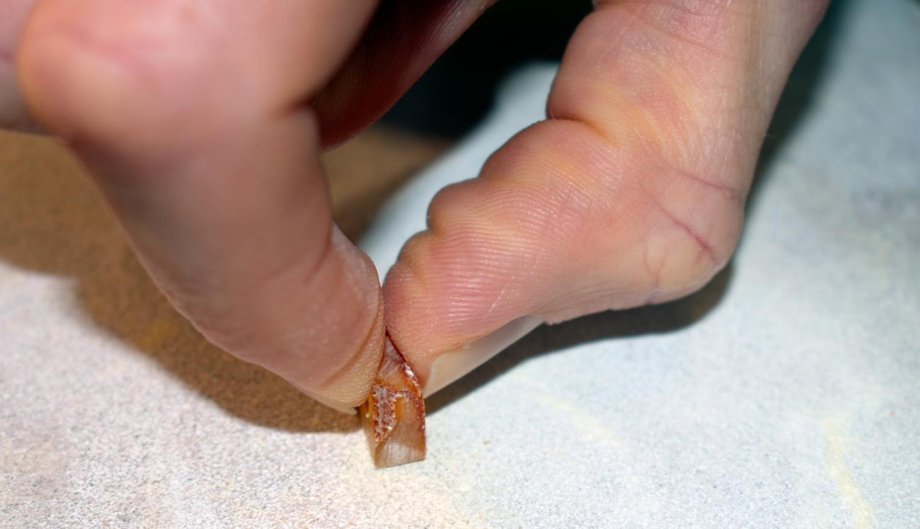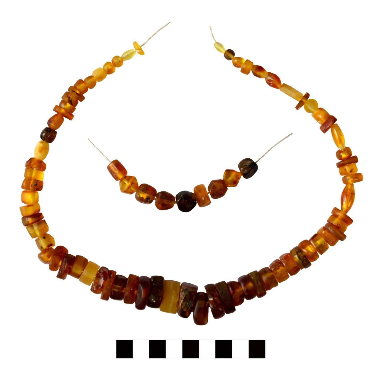 The ease of shaping the beads also depends partly on the size of the raw amber piece being worked. Larger pieces are much easier to hold steady for carving or grinding than smaller pieces. Possibly very small beads would have been clamped in place, affixed to a stable surface or threaded onto a rigid tool to facilitate shaping. The latter proved useful in creating the tapering shape of convex biconical beads. The issue of holding very small beads comfortably in the hand meant that, paradoxically, they often took a longer time to shape than the larger beads.