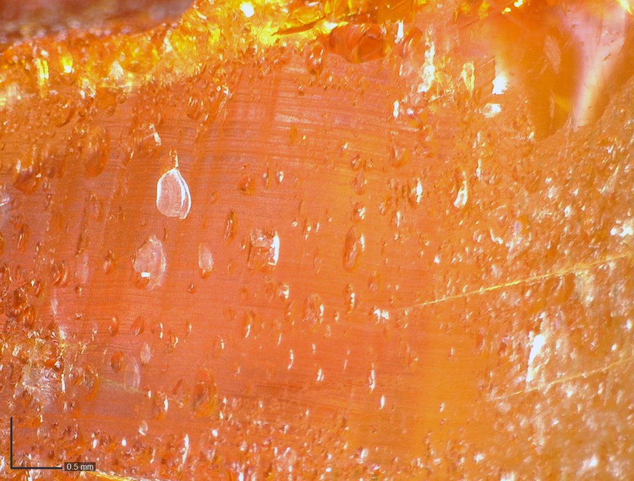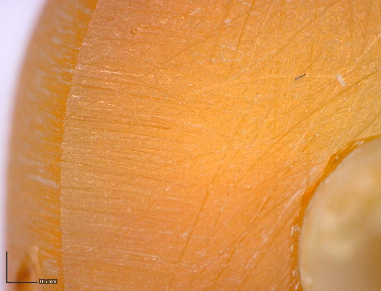The evidence from the Viking Age workshops has suggested that a knife was the tool consistently used for roughing out (e.g. Ulbricht, 1990, p.86; Mainman and Rogers, 2000, p.2501; Gerds, 2001, p.117). Amber is easily carved with a knife, and with practice, it is possible to both shave away material smoothly or to chip away larger flakes (See Figure 6). A sharp blade is essential; blunt tools proved almost unusable. The knife left a series of linear scratches on the surface of the amber parallel to the path of the blade and, perpendicular to it, elongated ovoid pits (See Figure 7; Mainman and Rogers, 2000, p.2501; Egan and Pritchard, 2002, p.307).
