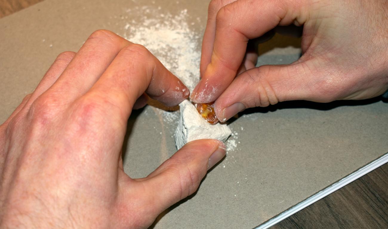 Two polishing agents were tested in the present experiments: lumps of natural chalk and the small chips, drill filings and amber dust produced during the shaping of the beads. In the case of the chalk the amber beads were first rubbed firmly across the surface of a substantial piece of chalk (See Figure 17). It was possible to create the same kind of conical chalk cores as recovered from York in this way. This produced a great deal of fine chalk powder, which could then be mixed with a suitable lubricant and applied as a polish using scraps of coarse linen cloth. The amber waste was used in the same way (See Figure 18). Rapeseed oil was utilised as a lubricant, but animal fats or saliva would have had the same effect. The chalk proved to be more effective than the amber filings at removing manufacturing marks from the amber beads. After 15 minutes of polishing using chalk, the shallower surface marks had begun to disappear, whereas the same traces remained visible after amber dust was used for the same amount of time.