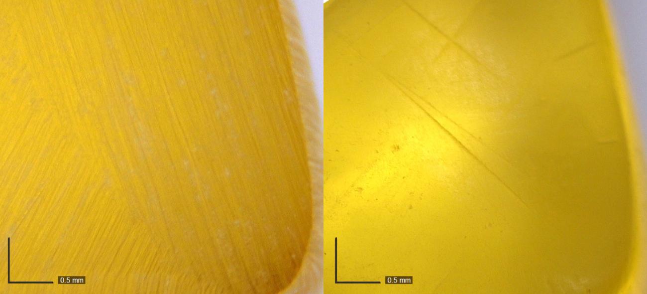 At least 25 minutes of polishing time using solid chalk and powder in combination was required to remove surface striations to the extent that they were no longer visible to the naked eye (See Figure 19). Particularly deep striations resulting from the shaping of the bead are still evident under a microscope, and it was difficult to fully polish away all manufacturing traces. As noted, tool marks are relatively rarely identified on extant early medieval beads, although it is not clear how systematically these were removed during the finishing of the objects, since this manufacturing evidence could also be lost to wear and degradation of the surfaces in the burial environment. One additional benefit of polishing is the improvement in the appearance of the beads. Both the beads polished using chalk and those using waste flakes and dust showed increased transparency and, in the case of the thicker beads, a deepening of the colour towards a deep reddish orange.