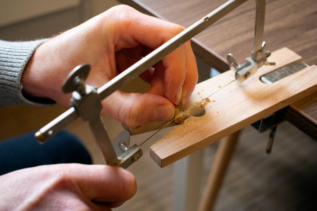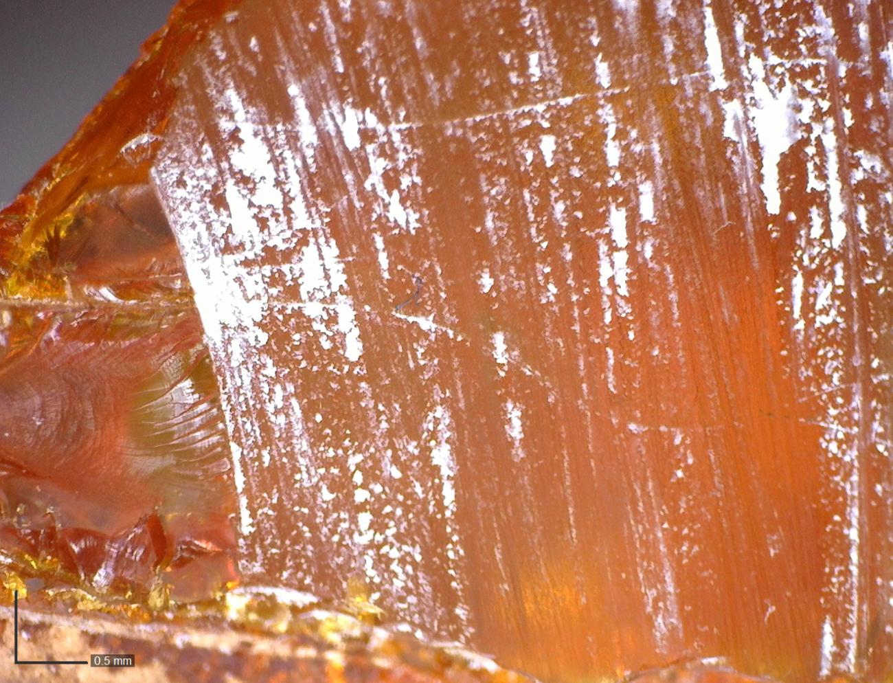 The present experiments primarily used a jeweller's saw fitted with steel blades to divide larger pieces of amber (See Figure 4). It is possible to cut through amber using a knife, but this has the twin disadvantages of taking more time and producing a V-shaped cut that results in the loss of more material, so the saw is preferred. Sawing amber proved to be a relatively quick process, requiring minimal physical effort. The longest recorded time was around 18 minutes to section off the required piece from a lump of raw amber measuring 23.5 x 17.7 x 8.8 mm, but most of the smaller pieces required much less time to cut to size, typically less than ten minutes. Once the saw has passed through the bulk of the amber, the process can be further sped up by snapping off the remaining stub. Sawing produces a series of horizontal striations on the cut surface of the amber (See Figure 5).