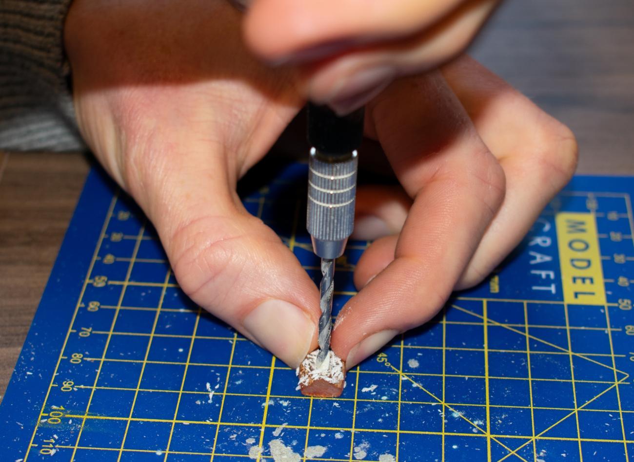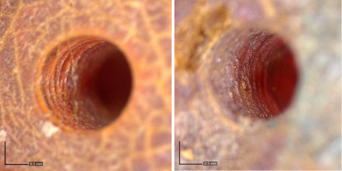 To quantify both the success rate of drilling and the time required for the process, a series of 141 drilling experiments was undertaken. These included both unworked slabs of raw amber and the replica bead blanks. The colour of the raw amber, depth of material through which the drill passed, time taken and the outcome of the experiment were all recorded. The replica beads were primarily perforated using the handheld drill, because it was possible to switch out the drill-bit to correspond as closely as possible to the measured diameter of the original bead. The unworked amber chips were drilled using both the handheld drill and the bow drill.