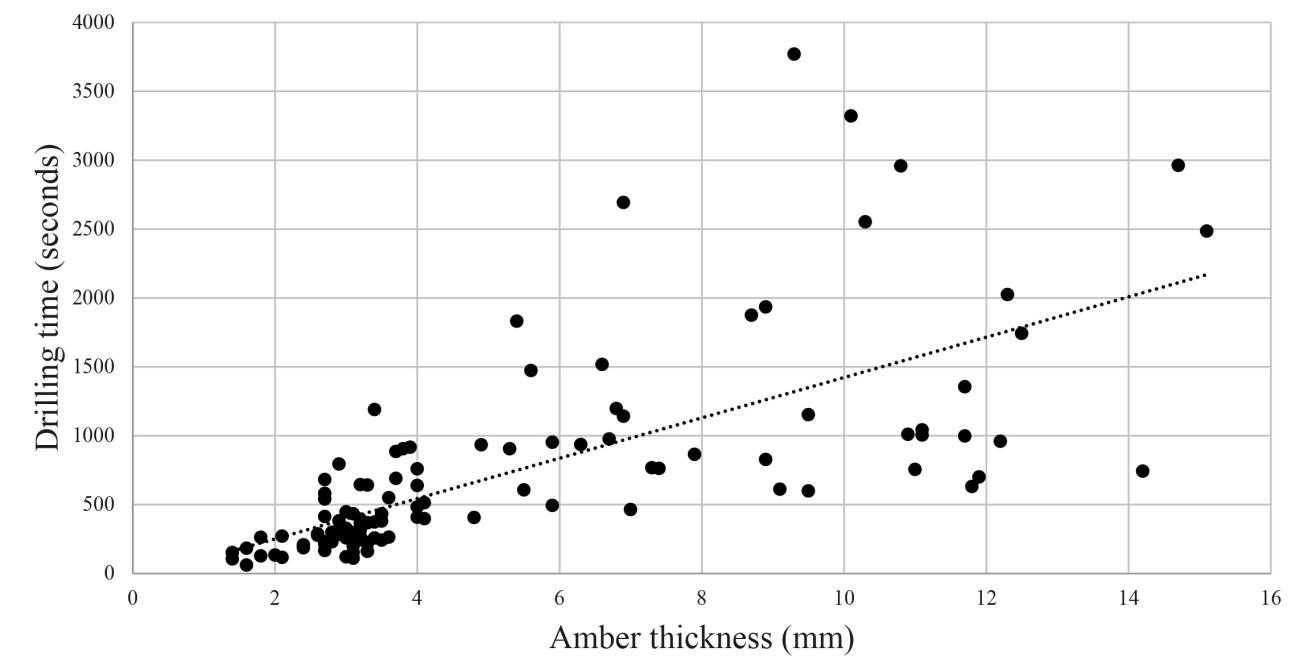 As might be expected, there was a correlation between the time needed to drill a piece of amber and the thickness of the material itself; thicker pieces required more drilling time than thin slabs. However, the correlation between the two is not particularly strong (See Figure 13). Other factors played a role, including the shape of the bead blank and the affordances of the amber itself. It was also noted that the drilling time even for thicker pieces reduced as the skill level and confidence of the drill operator increased. Most of the pieces of amber perforated during the course of the experiments, ranging between 1.4 and 15.1 mm thick, required between four and 16 minutes of drilling time. Similarly, Fiorentini (2022) recorded a time of ten minutes to drill a piece of amber 5 mm thick. The size of the drill-bits used did not make a noticeable difference to the effort or time required to perforate the amber.
