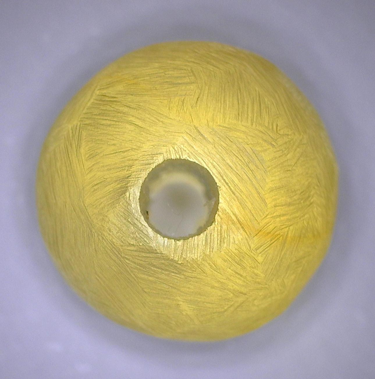 Drilling the convex biconical beads, even in their roughed-out form, proved to be the most challenging of all the replicated shapes, because the length of the bead through which the drill bit passed is proportionally much larger than the maximum diameter. The delicate, tapering shape of these beads could, without exception, only be formed after drilling cylindrical bead-blanks, as the faces of the bead were otherwise too small to accurately drill. Even so, often there was some chipping around the perforations caused by the drill, which can be seen when the bead is viewed from the side.