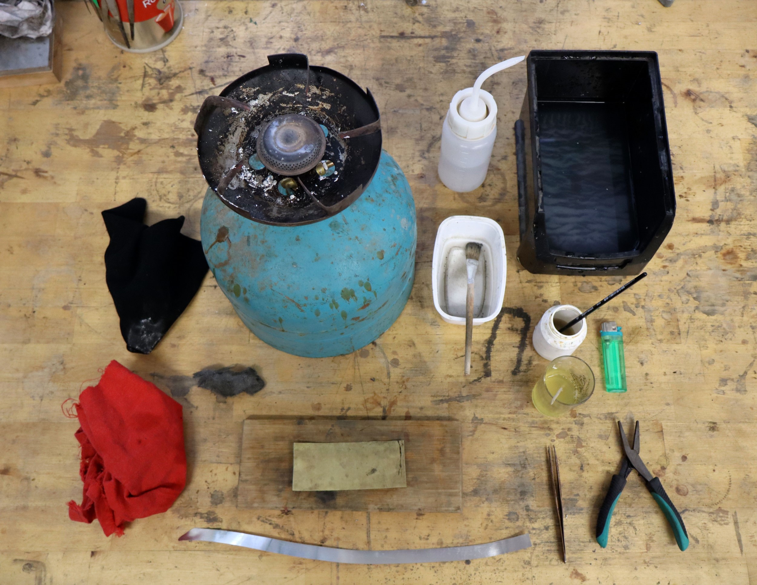 The setup followed established practices for hand tinning (e.g. Fuller, 1833, pp.20-21; Flanders, 1900; Brown, 1913, pp.58-59) (See Figures 9-10). Brass sheets, 0.5 mm thick to match the Mušov chest plate, were used as the base material. Each sheet was thoroughly cleaned first by light rubbing with steel wool, followed by chemical cleaning with sulphuric acid (vitriol). Heating was provided by a gas camping stove fuelled with propane-butane, chosen for its ease of temperature control. Additional tests were later conducted using a small open-pit charcoal hearth (See Figure 11).