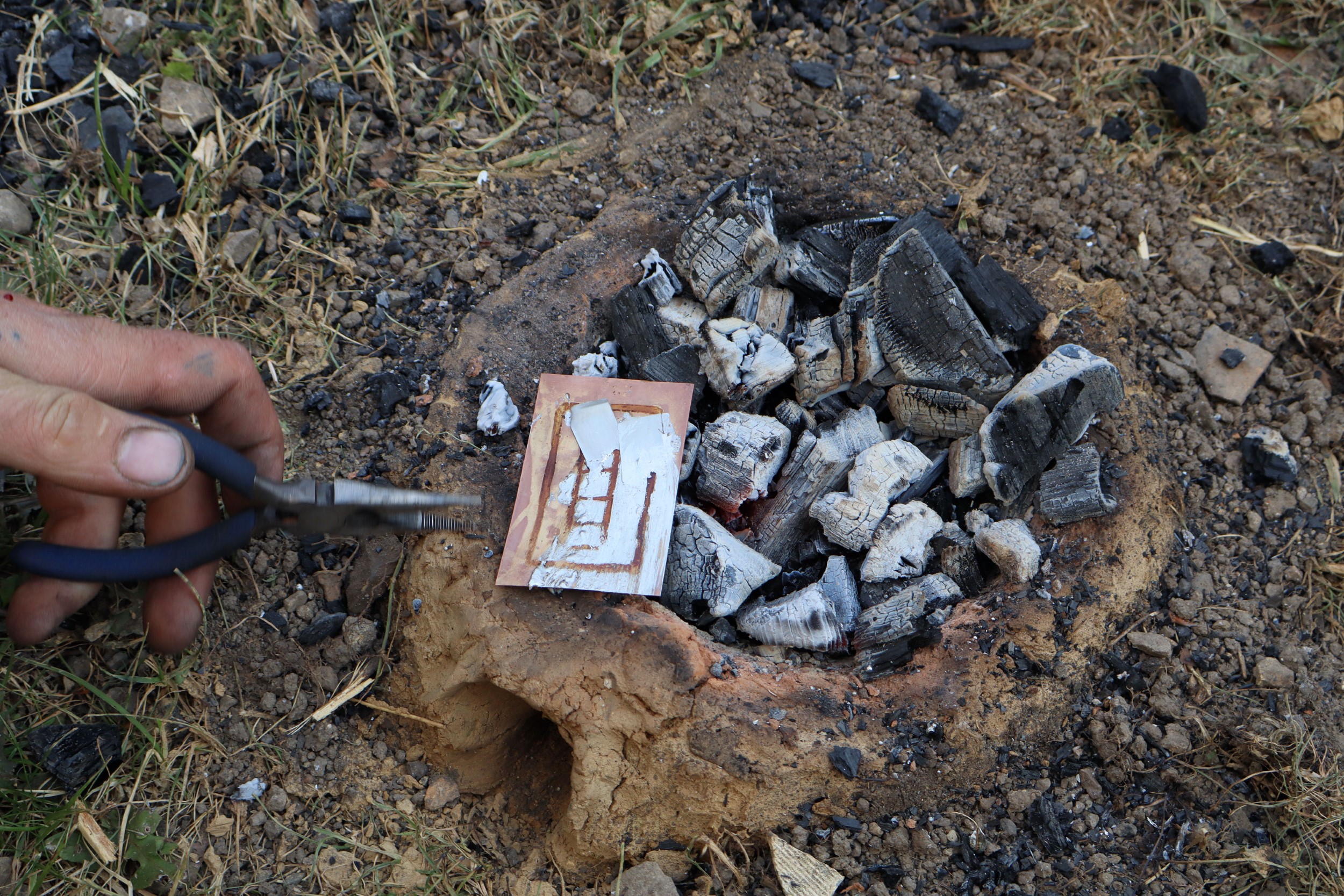 Carbon, haematite, and clay slip performed poorly. Once dry, these substances could be wiped away with a simple touch, making them unsuitable for masking. Honey and sugar water also proved ineffective. When the brass sheet was heated for tinning, the water in both substances began to boil and spread uncontrollably, forming amorphous blobs and losing any clear definition.