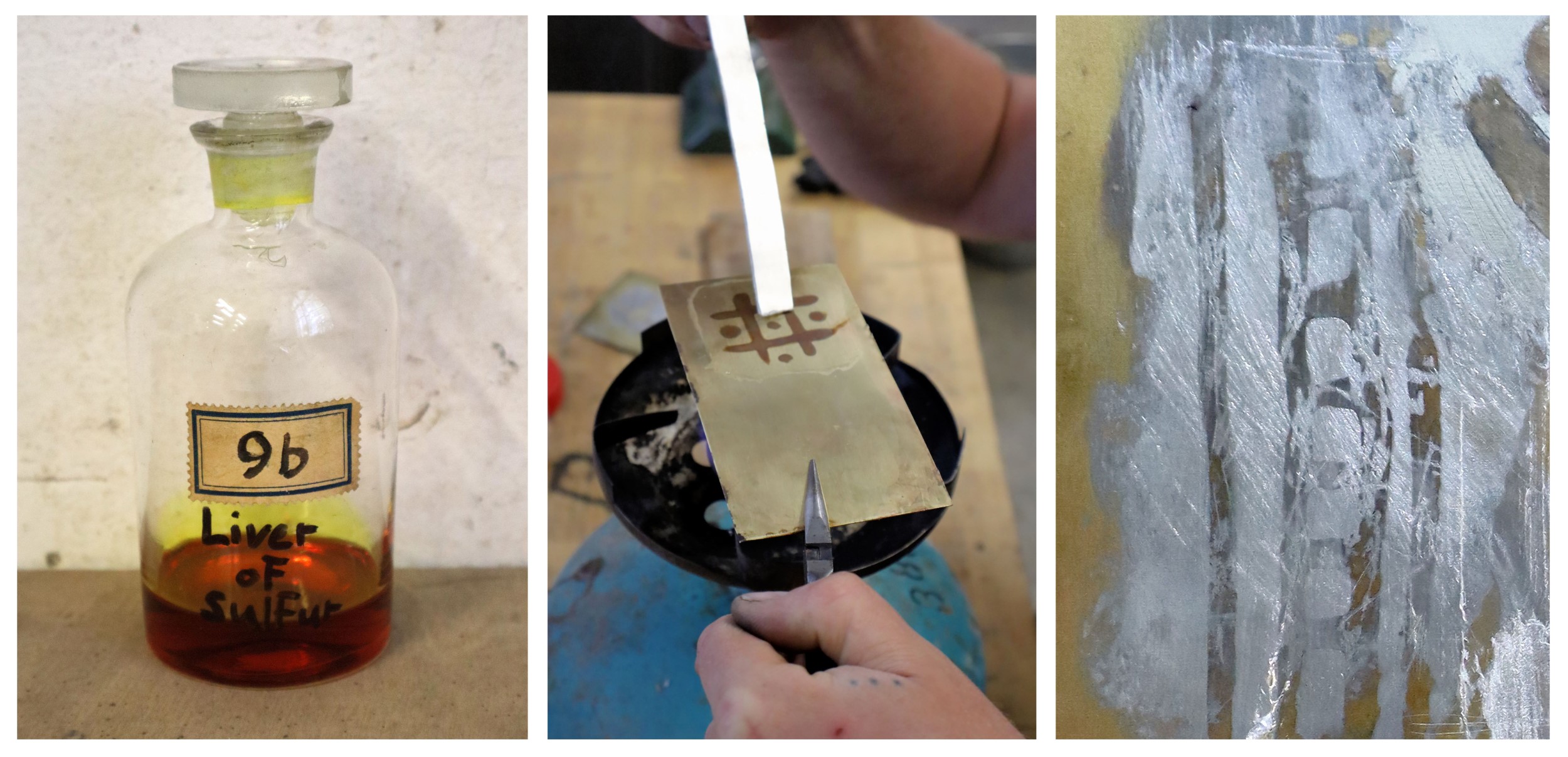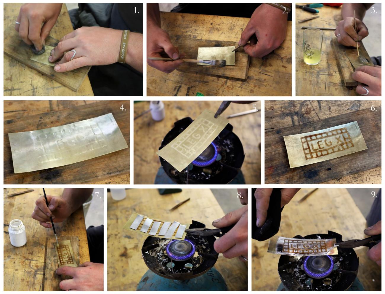 The tests comparing unprocessed egg white to egg glaire showed a clear advantage for the latter. Egg glaire proved significantly more resistant to rubbing and wiping during the tinning process, making it more suitable for this type of application. Figures 16 and 17 show the complete chaîne opératoire of partial tinning using egg glaire, demonstrated on a larger surface with a complex pattern.