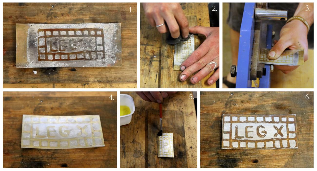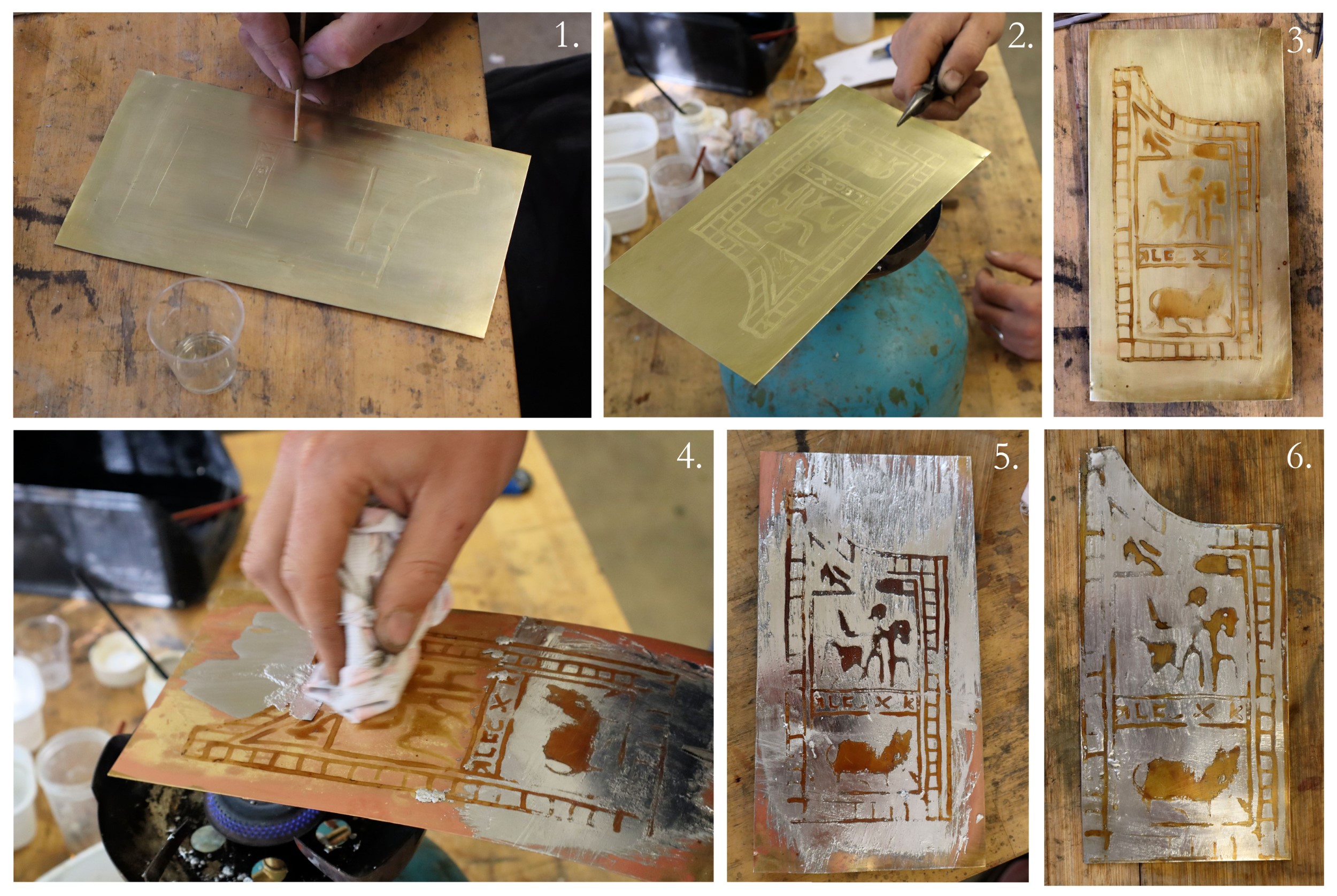 Once the desired colour was achieved and the glaire allowed to cool, flux was selectively applied to the areas intended for tinning (See Figure 16.7). The entire object was then reheated to generate the temperature needed to melt the tin, which could then be wiped across the surface (See Figure 16.8-9). After tinning, the object was left to cool and then lightly scrubbed to remove any remaining glaire and to polish the finished surface. Interestingly, although some masked areas received a thin coating of tin, the egg glaire beneath remained intact and could be removed without difficulty during scrubbing (See Figure 17.1-2). Finally, the object was then trimmed to its final shape (See Figure 17.3-4), As mentioned above, over time the artefact will develop a light oxidation layer, further enhancing the contrast between the tinned and untinned brass areas. Liver of sulphur was applied to expedite this natural process (See Figure 17.5-6).