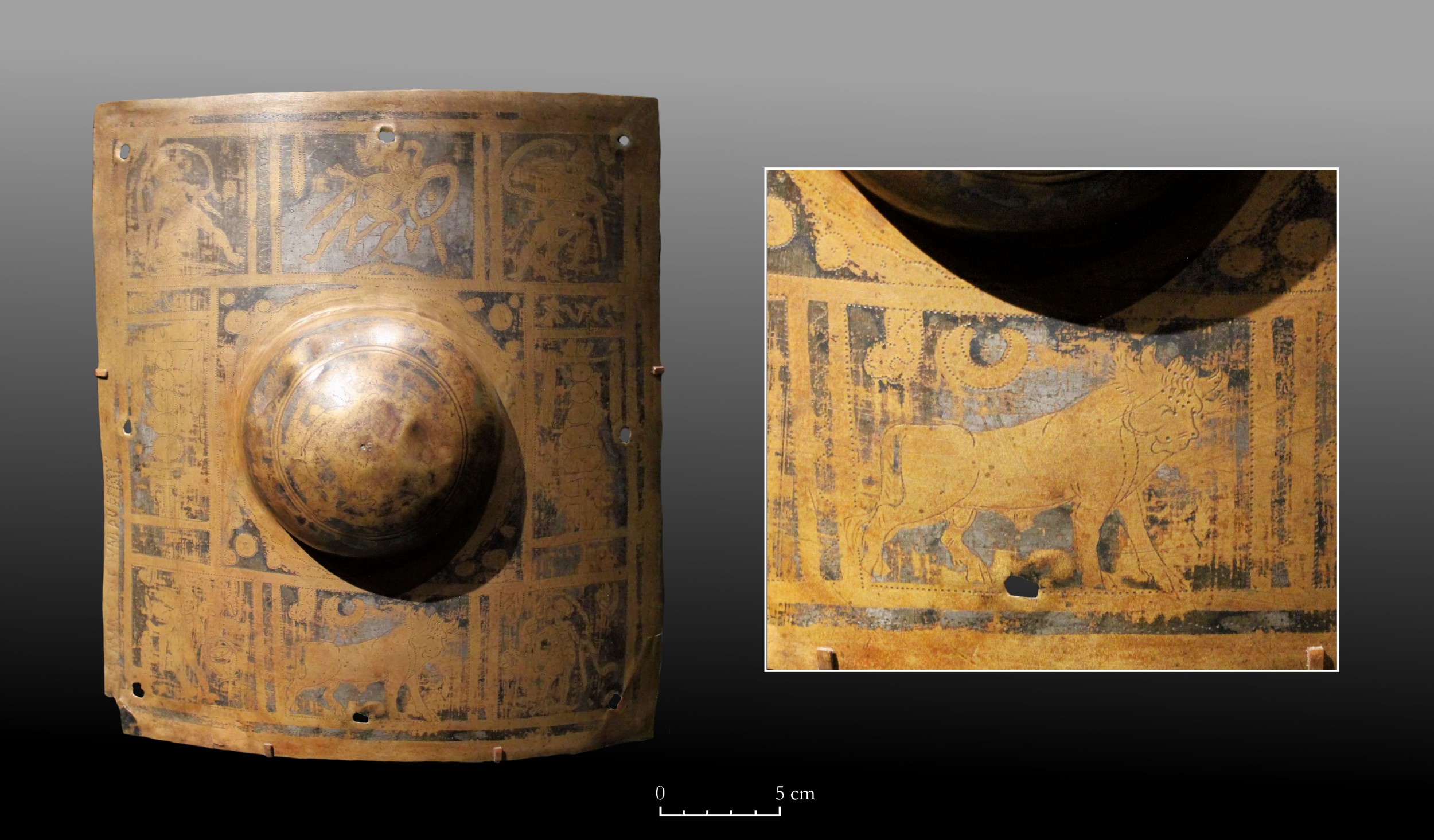 In some modern reconstructions (typically employing non-Roman techniques) tinning is applied only to recessed areas, such as the background, leaving the raised or embossed features untreated (e.g. Junkelmann, 1996). This approach uses the tinning to create a visual contrast, making the relief stand out by colour difference. Numerous examples of partially tinned armour confirm that this is indeed one possible application. Surviving artefacts reveal, however, that the original technique was considerably more sophisticated than these reconstructions or passing mentions suggest. Partial tinning was not merely confined to recessed areas to enhance relief but was also used independently as a decorative element. In many cases, tinning appears on raised or flat surfaces where it does not serve as a background contrast but instead functions as ornamentation in its own right. This decorative use of tinning, independent of relief, is particularly evident on smooth pieces of defensive equipment, such as the shield boss from the River Tyne (See Figure 2).