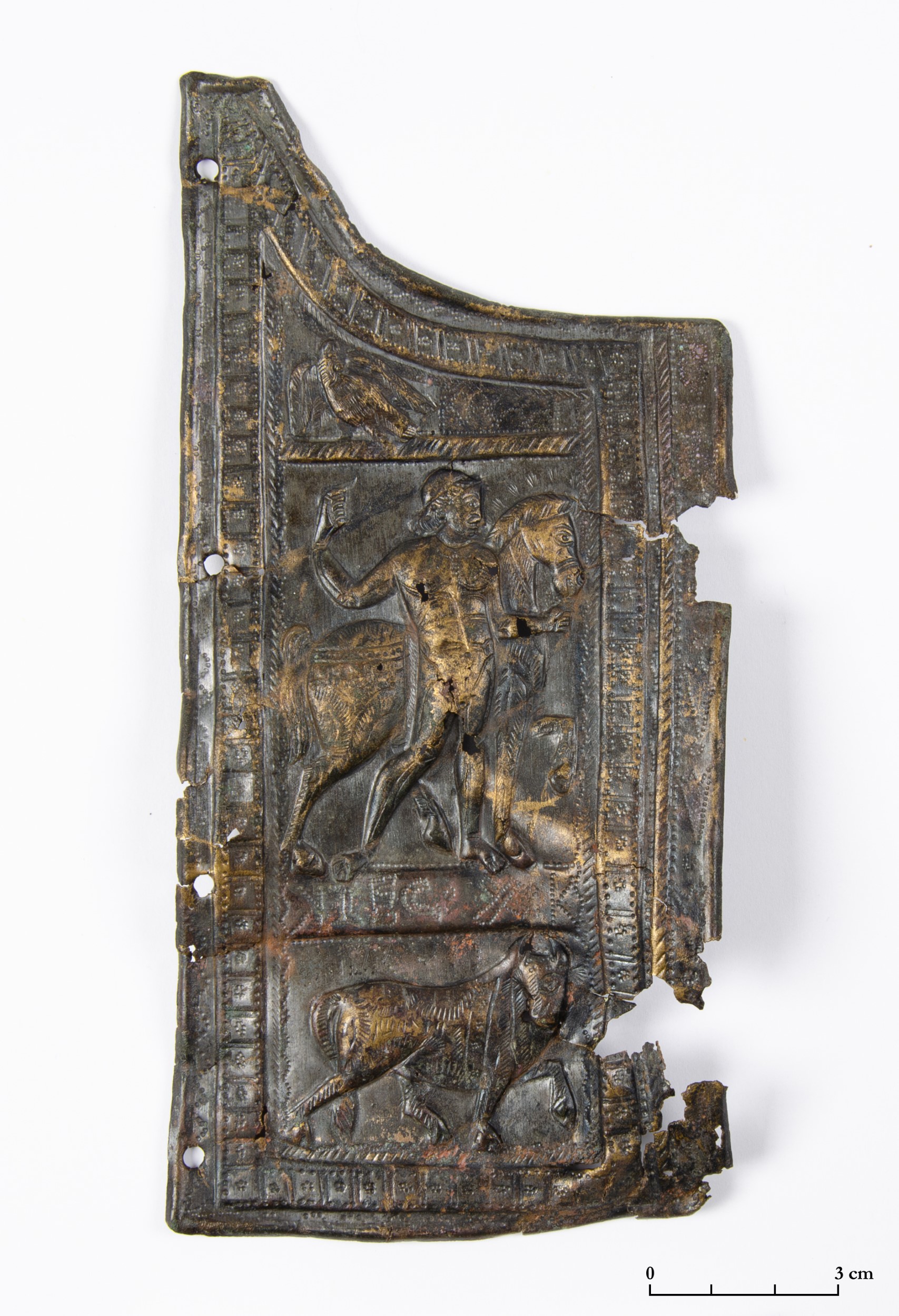This form of partial tinning is particularly common on armour pieces often referred to in German as Paraderüstung, or parade armour (See Figure 1). These items are characterised by their elaborate decoration and frequently include embossed motifs with military themes (Garbsch, 1978; Schamper, 2015; D'Amato and Negin, 2017). The long-held assumption that such armour was used only in parades or cavalry games has been increasingly questioned. These pieces are now often considered to have been part of functional battle equipment (e.g. Fischer, 2019, p.198; Guillaud, 2019, p.218). Partial tinning is also found on smoother pieces of equipment, not only on those with heavy embossing. A good example is a shield boss found in the River Tyne near South Shields in the United Kingdom (See Figure 2), where partial tinning was used to draw attention to more delicate punched and incised designs (Klumbach, 1966, pp.175-178).