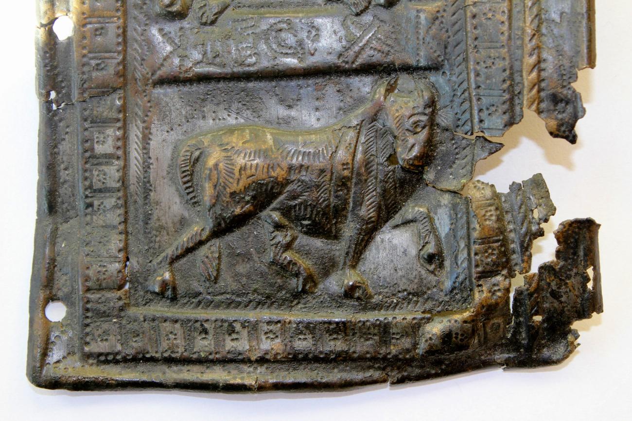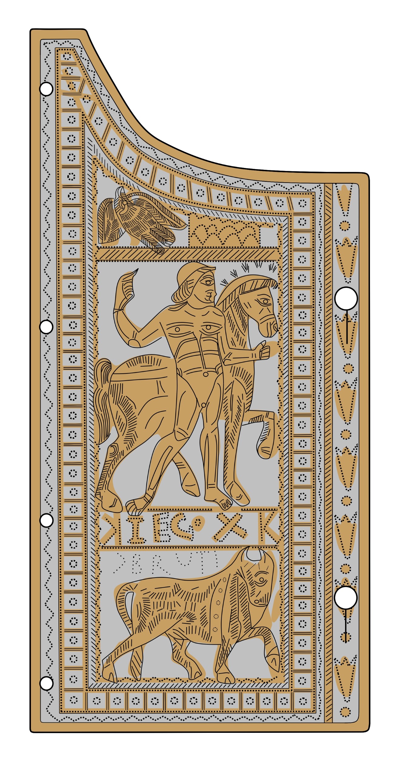 The micro-XRF analysis revealed the extent of the partial tinning applied to the Mušov chest plate, offering insights into both the tinned areas and those intentionally left uncovered (See Figures 6-7). The results indicate that the partial tinning was achieved by masking off the areas meant to remain untinned. Two clear features of the chest plate decoration support this conclusion. First, in several places the untinned lines intersect, and in some instances a brush stroke slightly oversteps the boundary of the intersecting line, suggesting a masking substance was applied to prevent tin adhesion (See Figure 7, bottom). Second, a mistake made by the craftsman at the top of the chest plate shows another intersection of untinned lines, which could only have been created through the application of a mask (See Figure 7, top). The Mušov chest plate thus demonstrates that partial tinning was achieved through masking and not by painting the tin selectively onto the surface. A reconstruction of how this chest plate would originally have looked like, is presented in Figure 8.