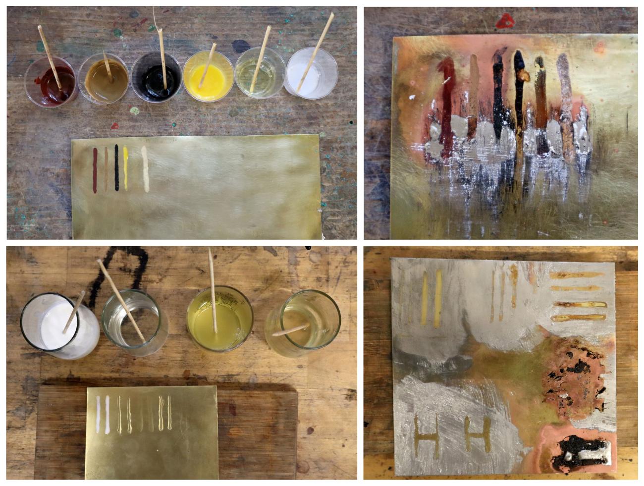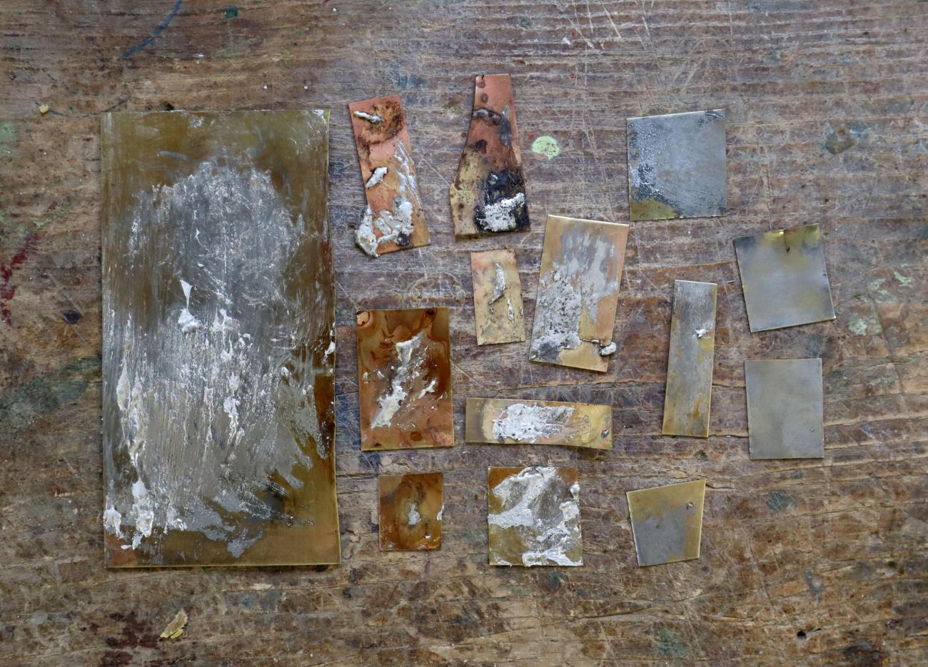 As mentioned above, the oxidation agents were applied to the cleaned brass sheet before the flux was added to the untreated areas. Several substances were tested: two types vinegar, baking soda, carbonite soda, and liver of sulphur. While the first are plausible within a Roman context, liver of sulphur (though widely used today) is not known to have been available in the Roman period. Each agent was allowed to react with the brass surface for two hours, with the exception of liver of sulphur, which reacts much more rapidly.