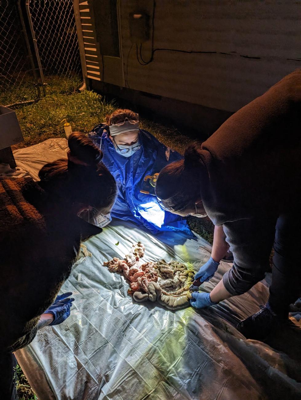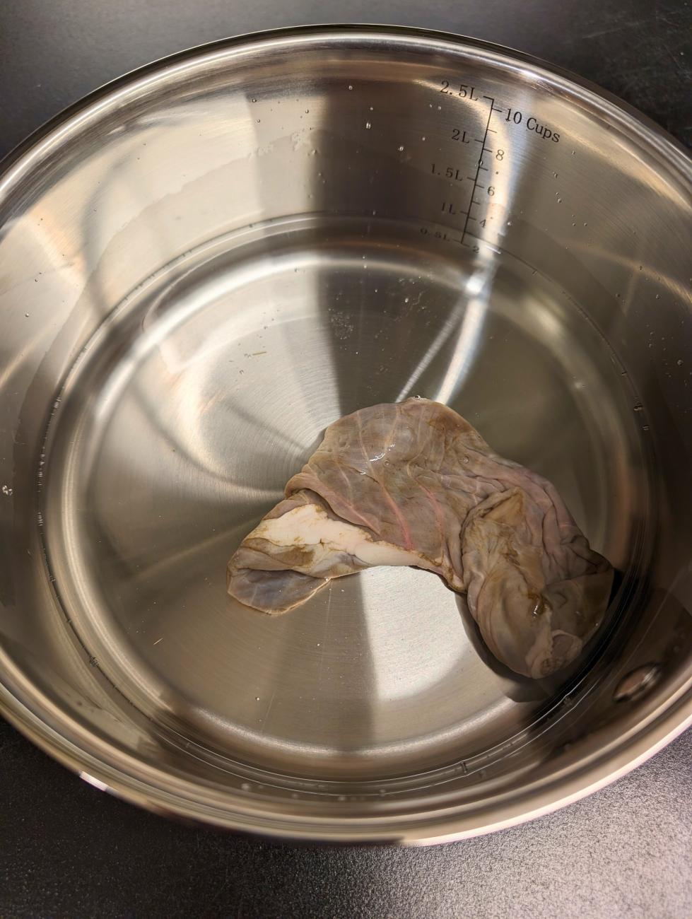 Once we retrieved the intestines from the butcher, we identified and removed the caecum, which had to be emptied of stool and rinsed (See Figures 1, 2). We placed the caecum in distilled water at 20:30 on Day 1 and removed it from the water at 08:10 on Day 2 (See Figure 3). We then turned the caecum inside out and created "limewater" using food-grade Calcium Hydroxide (1g Ca(OH)2 in 630 mL of H2O) to serve as our weak alkaline. We soaked the caecum in the calcium hydroxide solution for 12 hours, removed the caecum, and soaked it for an additional 12 hours in a fresh calcium hydroxide solution.