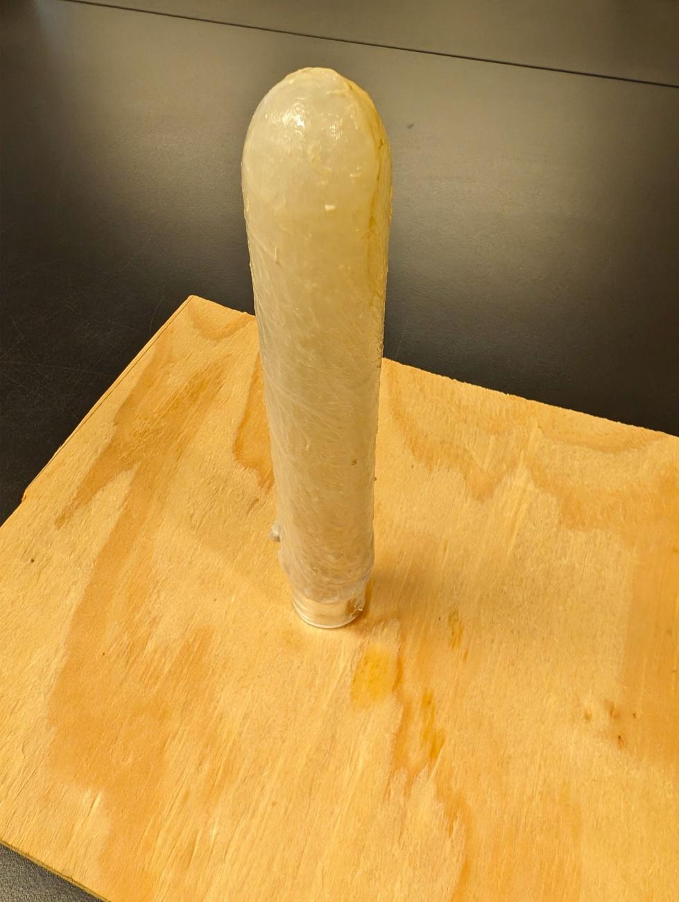 After removing the mucosa, we burned 99% pure elemental sulfur in a stainless-steel pot within a fume hood, hanging the caecum over the handle of the stainless-steel pot to expose it to the "vapour of burning brimstone." We then washed the caecum using Dr. Bronner's Unscented Pure-Castile Soap and distilled water. Finally, we stretched the caecum, external side in, over a glass mold that was oiled with olive oil (See Figure 4). We then removed the caecum from the mold, cut it to size, and sewed a ribbon around the opening (See Figure 5).