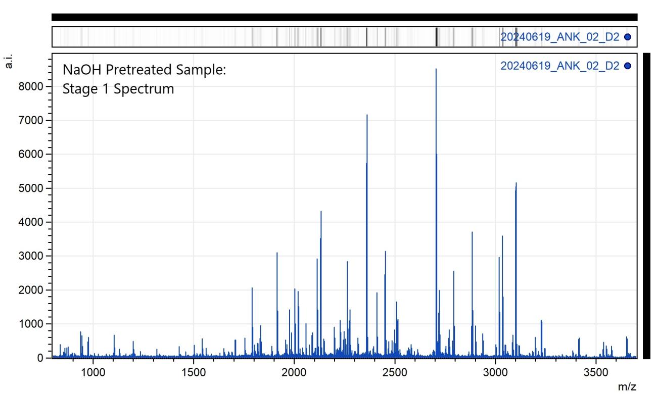 Approximately 1-2.5 g of intestine was sampled after each stage in the manufacturing process. Seven intestinal samples were freeze-dried to remove moisture, allowing us to record an accurate starting dry weight of each sample (Brock, et al., 2010, p.106), and two 1-11 mg fragments from each sample were removed for ZooMS analysis. For each manufacturing step, one of the two samples taken was rinsed in 200 µL of 0.1M NaOH to remove non-collagenous proteins that could affect the resulting spectra (Ebsen, et al., 2019; Lee, et al., 2022; Matinong, et al., 2022). NaOH causes the treated matrix to swell due to the breakdown of intermolecular bonds within the protein, which converts insoluble proteins into soluble proteins, resulting in increased protein hydrolysis. The increased protein hydrolysis enhances the removal of proteins but does not cause collagen hydrolysis because of collagen's triple helical structure. The removal of non-collagenous proteins using a NaOH treatment increases collagen content and purity (Lee, et al., 2022; Matinong, et al., 2022). The remaining samples were immediately rinsed with ammonium bicarbonate (AmBic). These two pretreatment methods were utilized to determine if non-collagenous proteins were obscuring ZooMS peptide peaks.