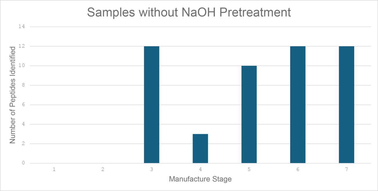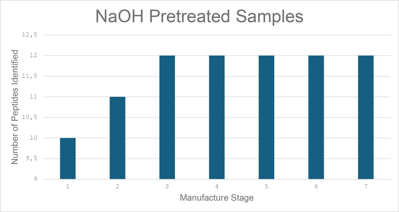 For each manufacturing stage, we ran two samples: one pre-treated with NaOH, and one that was not pre-treated. Of the 14 samples analysed, three (21.4%) yielded non-identifiable spectra. The remaining 11 samples (78.6%) resulted in clear species identification as sheep (See Graphs 1, 2). All pre-treated samples yielded clear spectra for interpretation, whereas three of the seven that were not pre-treated with NaOH yielded non-identifiable spectra (See Graphs 3, 4).