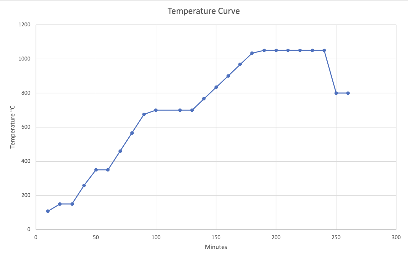 In order to replicate the manufacturing processes of LBA Egyptian glass, it was first necessary to consider the design of the crucibles. In the laboratory phase, the size of the furnace chamber, availability of glass for experimentation, and the feasibility of working with hot glass in an indoor environment were factors in the decision to use smaller, shallower crucibles than those found in association with glass production in LBA Egypt. A batch of 19 crucibles (c. 6.5 cm diameter) was made with grogged stoneware clay (grog is a ceramic temper formed from fired and crushed pots, which mechanically strengthens the crucibles against thermal shock). The crucibles were made by finger-pinching, then air-dried and fired to 1150°C in the Vecstar Furnace (See Chart 1).