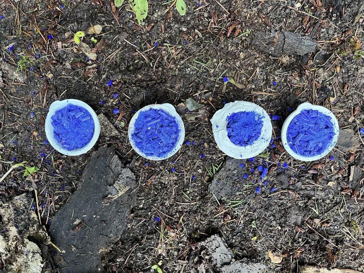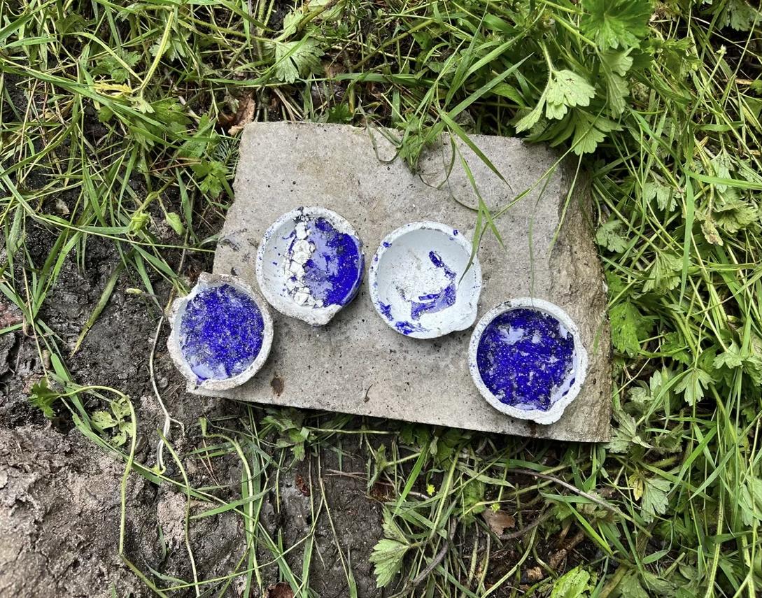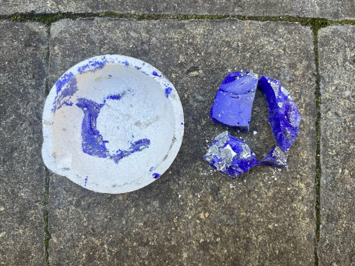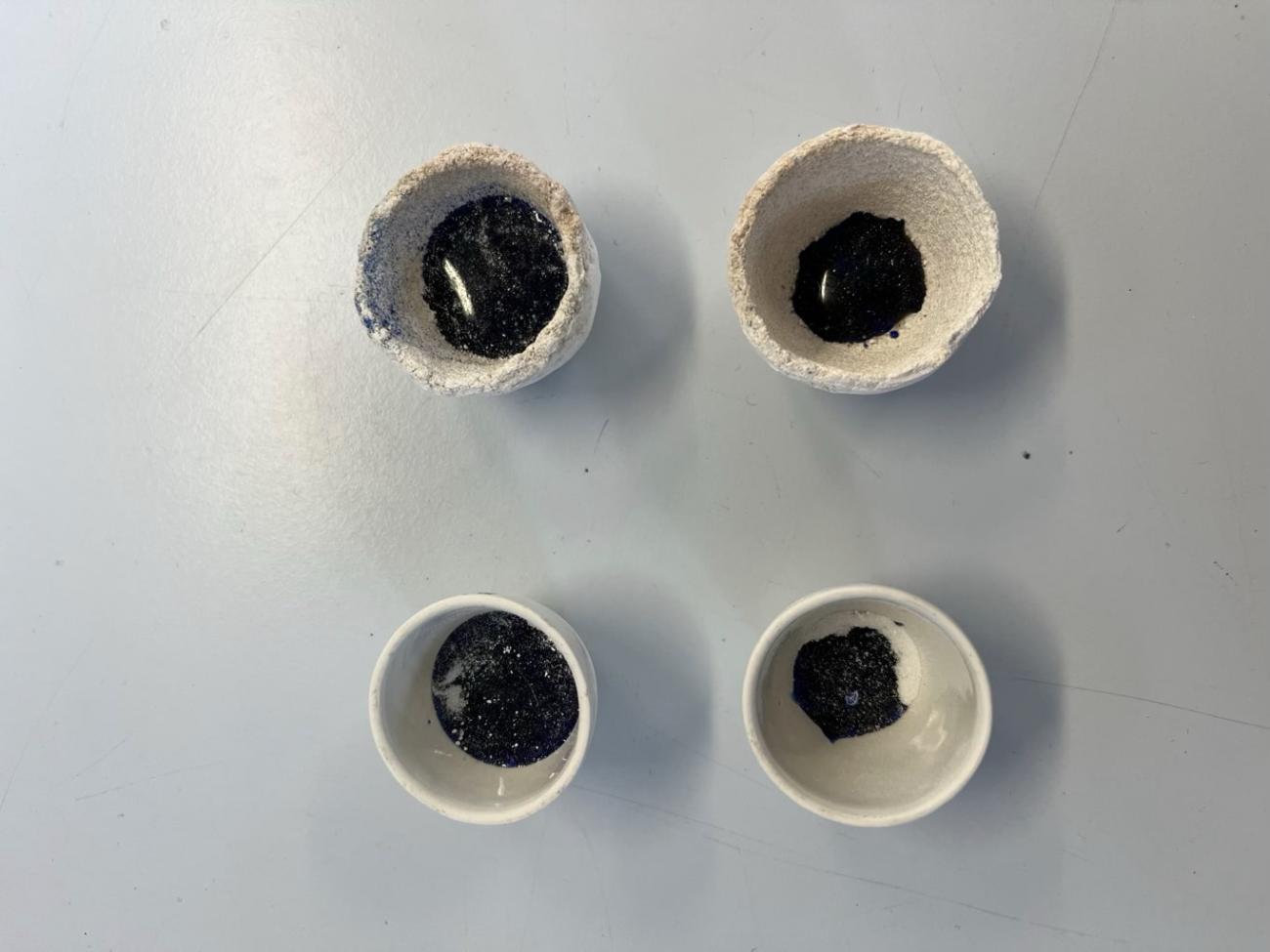 Following the Spanish Furnace Project, experiments were carried out at the Old Sawmill, Wallington National Trust Property, using a traditional, clay-built wood-fired furnace constructed there by the PEGG Research Group, Newcastle University, in 2022 (See Figure 9). Because there was only a limited supply of LBA replica glass, it was decided to use cobalt-blue Murano glass lampworking canes (Effetre 104) for further experiments due to their similar chemistry (soda-lime-silica) to LBA glass, and the homogeneity of their composition, which reduces experimental error. Ten blue Murano canes (Opq Med Lapis 591242) were crushed and ground using a pestle and mortar (See Figure 10). Four ceramic crucibles (c. 6.5 cm diameter) were used for this experiment, the separators for each crucible are as follows: