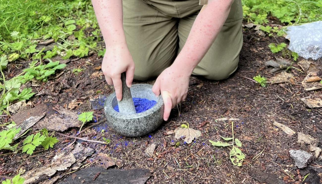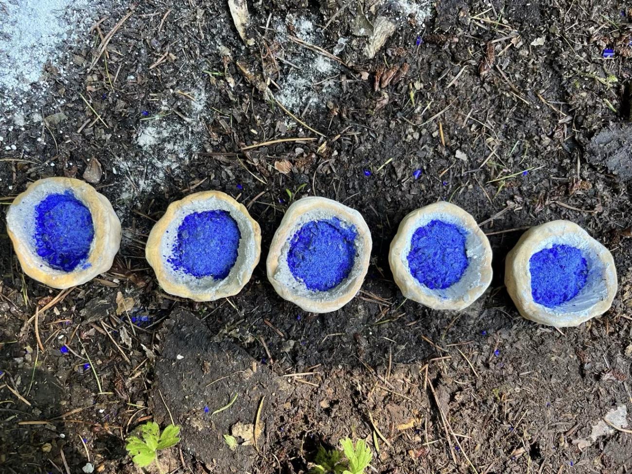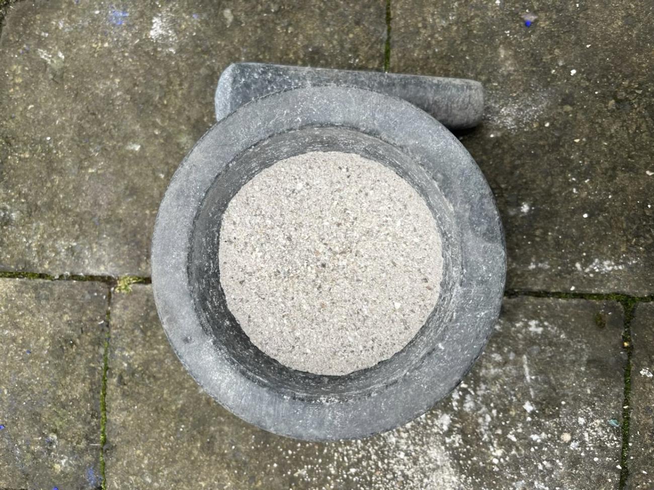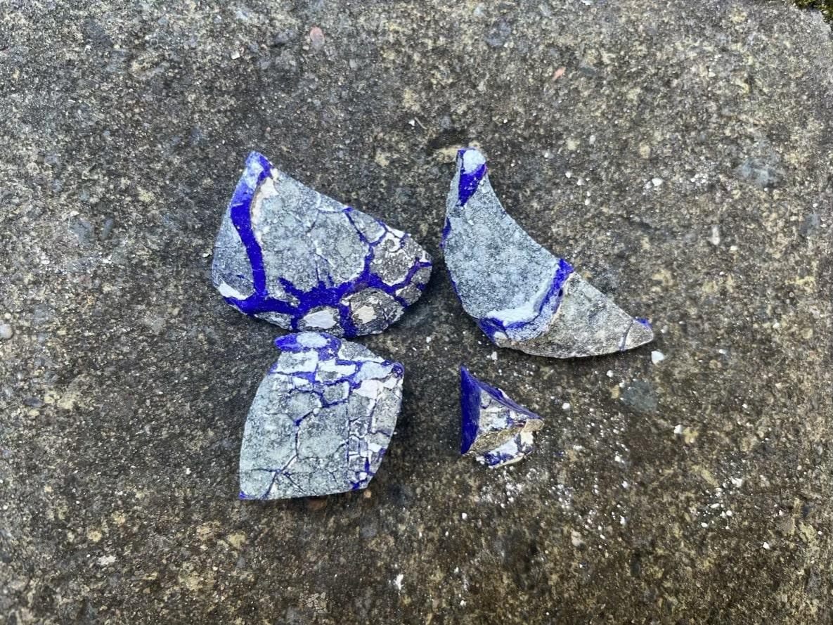 Following the Spanish Furnace Project, experiments were carried out at the Old Sawmill, Wallington National Trust Property, using a traditional, clay-built wood-fired furnace constructed there by the PEGG Research Group, Newcastle University, in 2022 (See Figure 9). Because there was only a limited supply of LBA replica glass, it was decided to use cobalt-blue Murano glass lampworking canes (Effetre 104) for further experiments due to their similar chemistry (soda-lime-silica) to LBA glass, and the homogeneity of their composition, which reduces experimental error. Ten blue Murano canes (Opq Med Lapis 591242) were crushed and ground using a pestle and mortar (See Figure 10). Four ceramic crucibles (c. 6.5 cm diameter) were used for this experiment, the separators for each crucible are as follows: