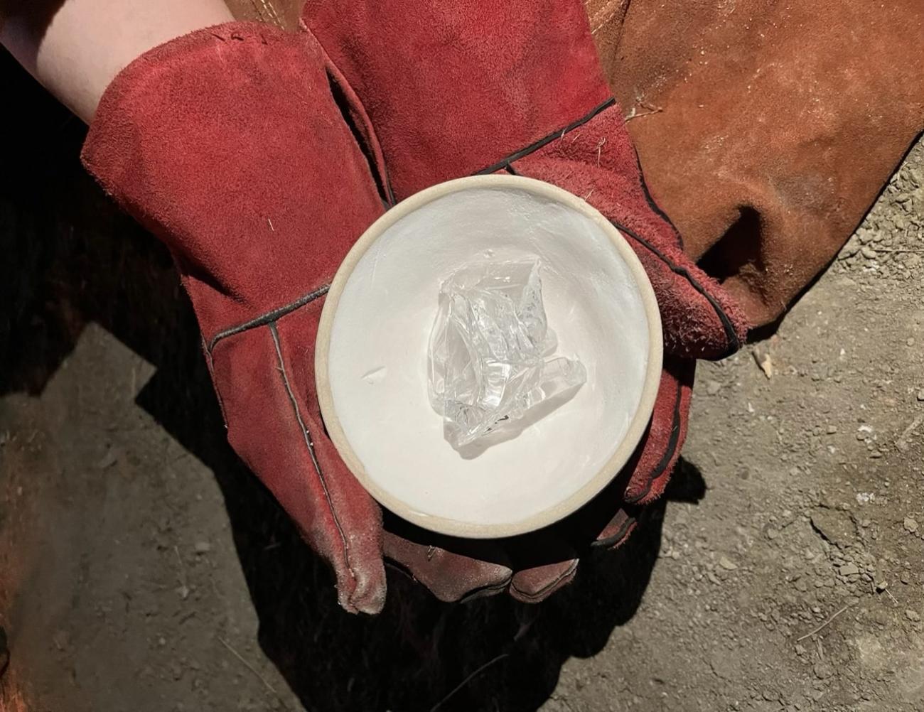 thickness (See Figure 6). Two ceramic crucibles (c. 12 cm diameter) were used for each batch of experiments. Due to the high porosity of ceramic material, it is generally a good thermal insulator (Rehren and Pusch, 1997: 137-138). The glass used was 'Glasma', a colourless soda-lime-silica material typically used specifically in modern glass studios. Glasma has a melting temperature of approximately 1275°C and can be worked from 1120°C (Studio Glass Batch, 2023). The glasma was added into the lined crucible in large chunks (>10 mm) without crushing and grinding (See Figure 7). Two crucibles were fired, one on each night of the furnace operation (1S and 2S). They were added to the furnace already charged with lining and glass, at c. 300°C and gradually raised over 2-4 hours (See Figure 8). Although temperatures fluctuated due to the challenges of stoking this large furnace, it maintained temperatures between 950°C and 1050°C for approximately 2 hours on the first night, and 4 hours on the second night.